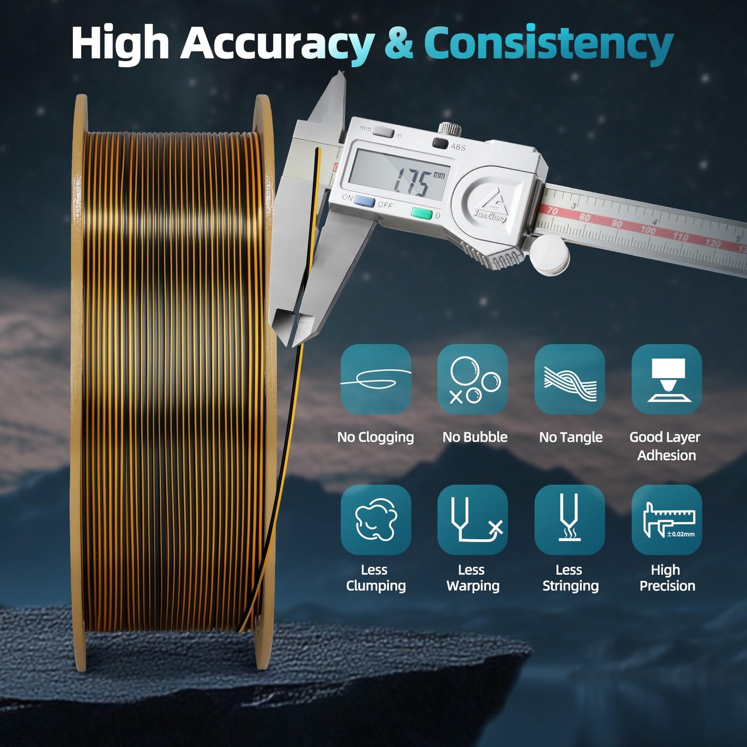 AICOPYTO Dual Color Silk PLA 3D Printer Filament 1.75mm,Dual Color 2-in-1 Gold-Black Silk Filament 1KG Spool (2.2lbs) Dimensional Accuracy Probability +/- 0.02mm Fit Most FDM 3D Printers, Black-Gold