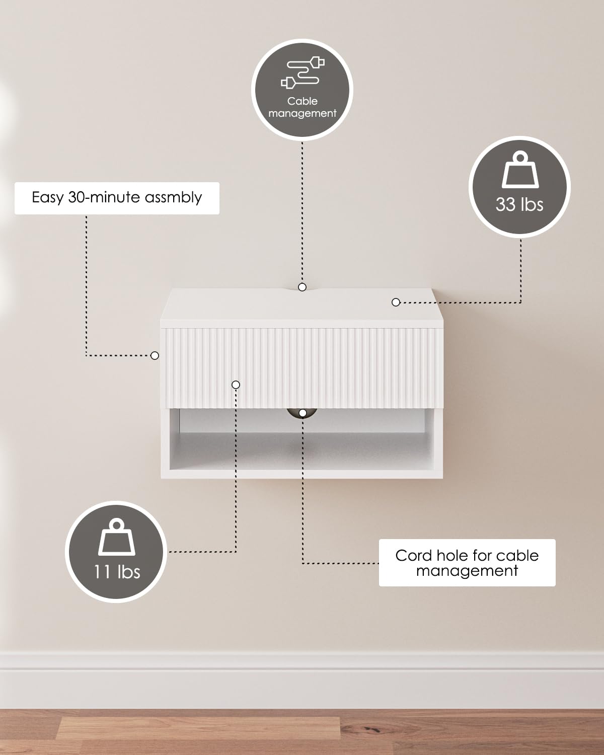 - Modern Convenient Design: Aienvey floating nightstand is a space saving modern piece with both closed and open storage. Get ready to take your bedroom's convenience level up a notch with this wall mount nightstand. The light and simple lines of the white nightstand with its neutral and natural tones makes it a perfect element to blend well with any furniture. White nightstand is the ideal companion for your modern bedroom.
