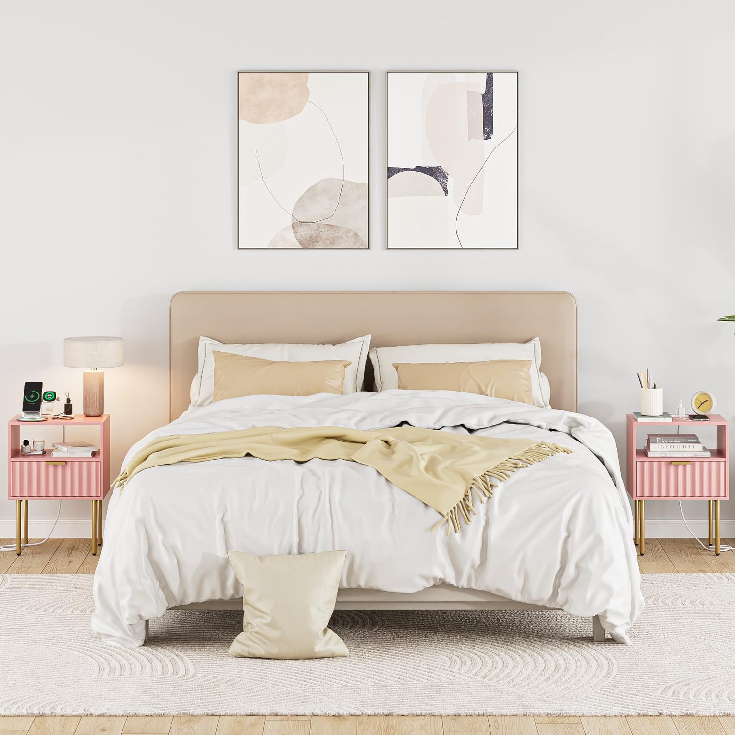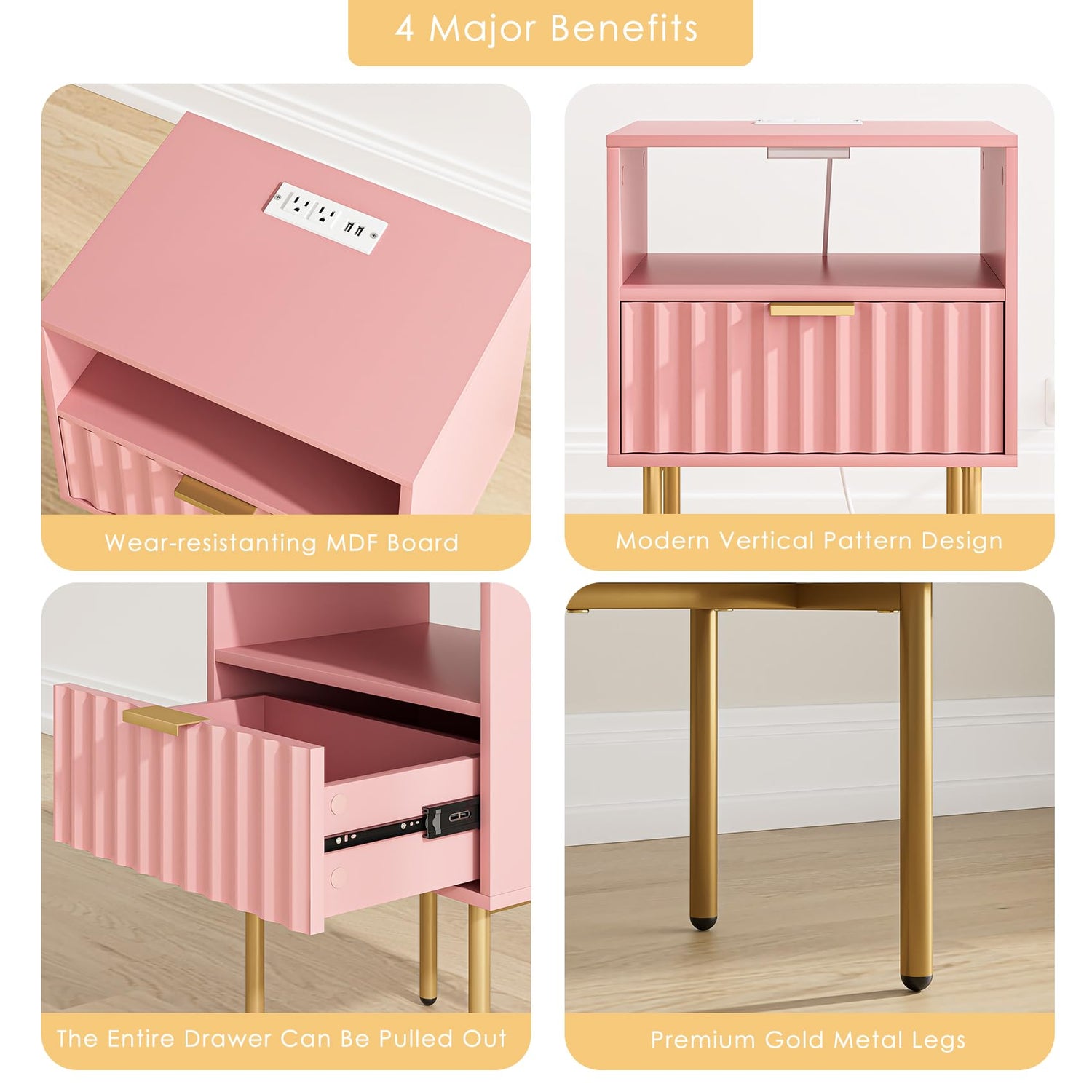 - Modern Fluted Night Stand: Vibe: Classic pink and matte gold design with charging station. This nightstand creating a simple and modern atmosphere, catching eyes as a side table or end table throughout the home, adding elegance to home life.