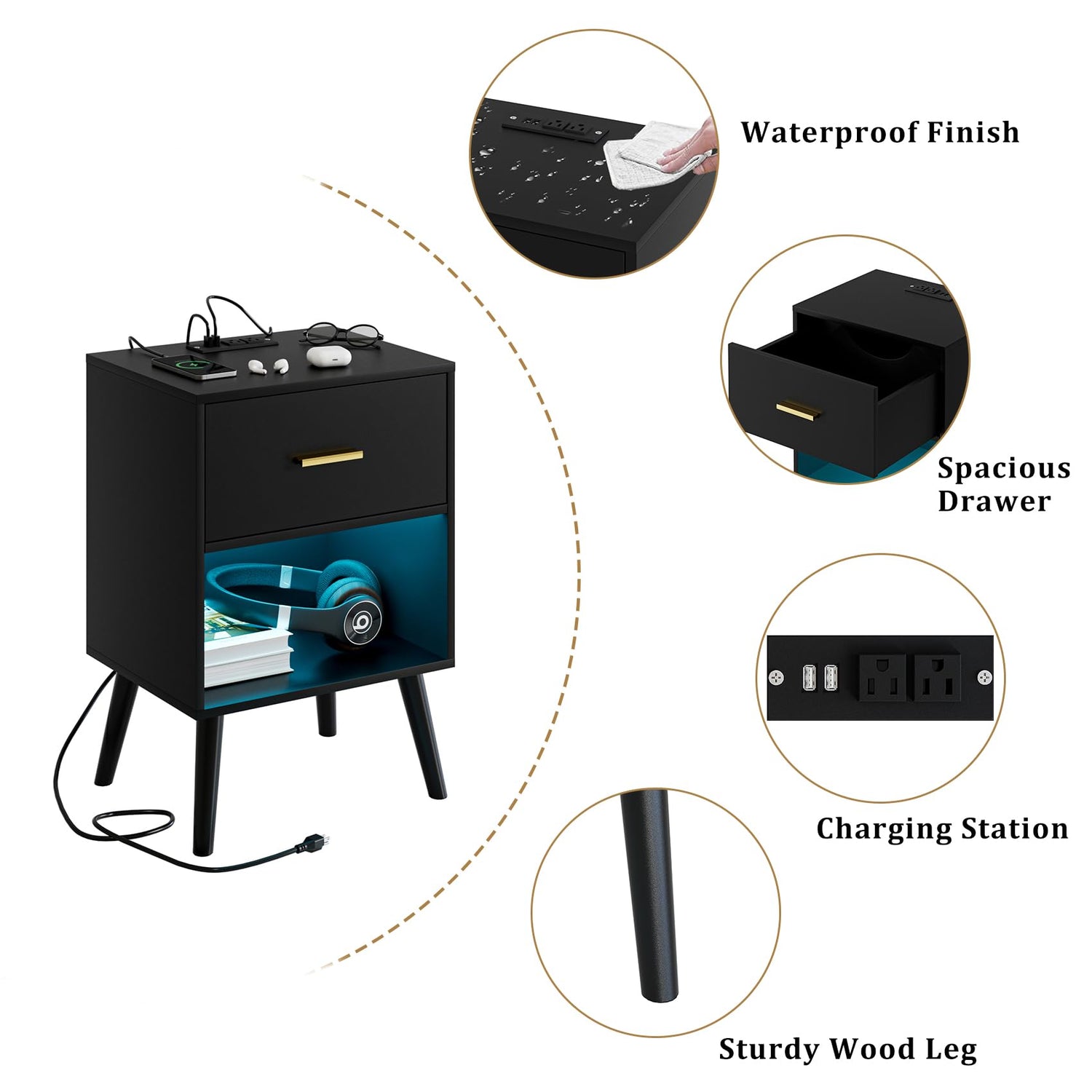 Aienvey Nightstand with Charging Station and LED Lights, Small Side Table, Bedside Table with Drawer, Modern Night Stand, End Table for Bedroom, Living Room (Black)
