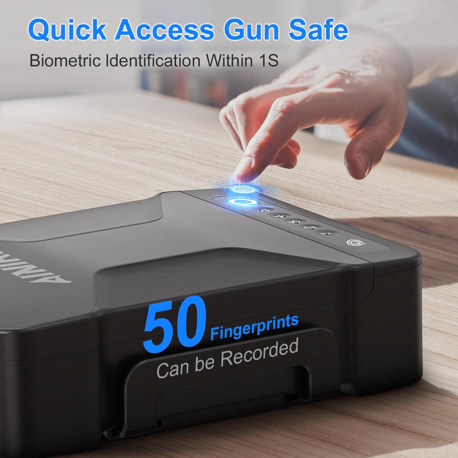 AINIRO Gun Safe for Handgun, Small Biometric Gun Safe with Built-in Handle Gun Lock Box for Pistols with Fingerprint, Keypad and Key Unlock Pistol Safe for Home, Car, Truck, Bedside Nightstand, Drawer