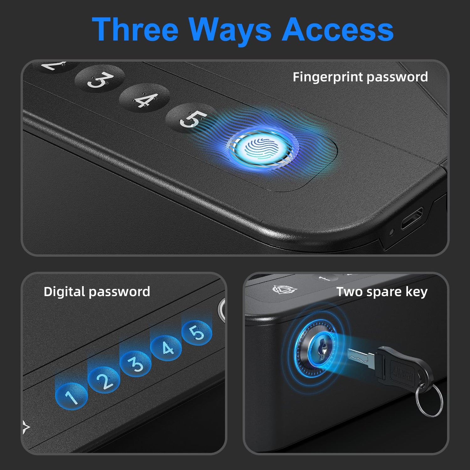 - 【Quick Access Gun Safe】Unlock your biometric gun safe with lightning speed with our fingerprint unlocking, opening the safe in just 0.5 seconds for quick and secure retrieval. And our pistol safe offer versatile 3 unlocking methods, keypad digital password, fingerprints password and traditional key access. This versatility makes it a top choice among biometric gun safes, providing quick access when seconds count while maintaining security for your handguns.