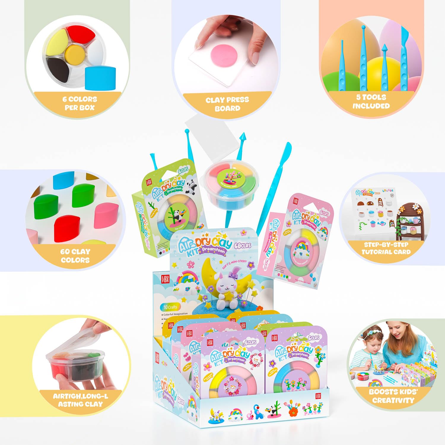 - 【LOUFOR Air Dry Clay Kits for Kids】- This Air Dry Clay Kit with 4 sculpting tools, 1 clay roller board and tutorial cards. The Modeling Clay is packaged 10 Boxes, Each box contains a can clay has 6 compartments filled with different colors, 60 colored Air-Dry Clays in total, providing enough clay to shape 10 theme models, allowing children or adults to create endless colorful sculptures and artworks.great for beginners making und artists.
