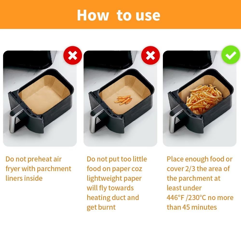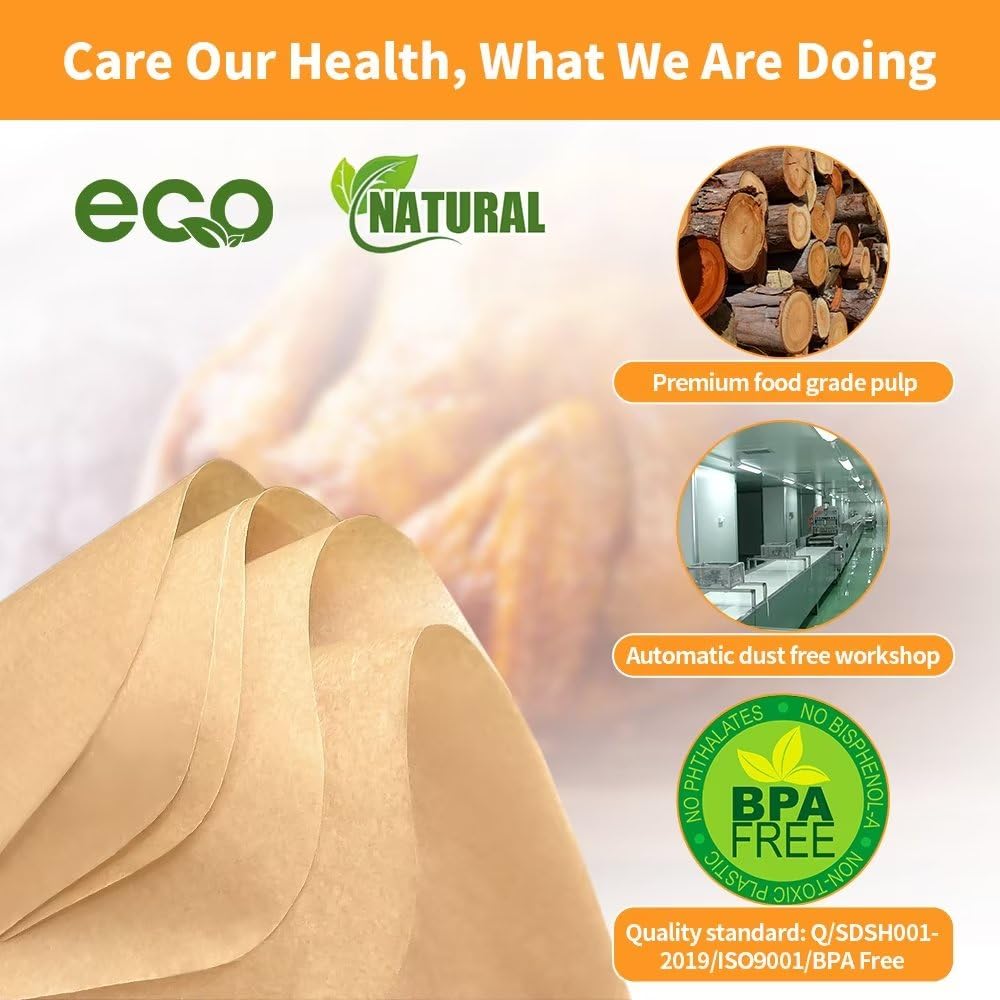 - 【Food Grade Material】 Our air fryer paper liners are made of food grade wood pulp with double-sided premium silicone Oil. keep food fresh and raw tasty coz of waterproof, oil-proof, non-stick, Heat resistance up to 446°F Meet the required temperature of 99% daily food served