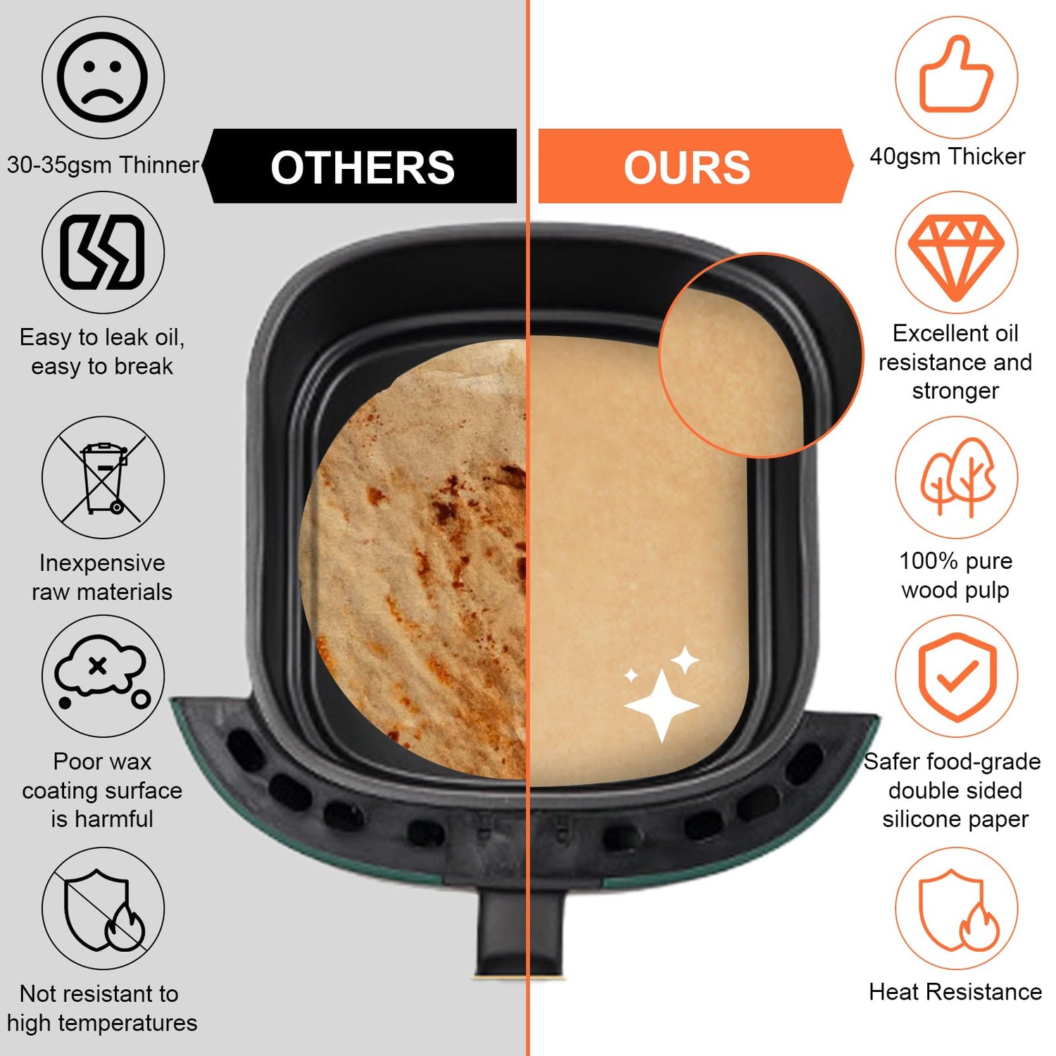 - Say Goodbye To Complicated Cleaning: Non-stick baking parchment can simplify cooking cleaning time. You just remove the disposable air fryer paper liner after baking and nothing left on your pan. and insures your cake that comes neatly out of the pan. Meanwhile, nonstick means less grease, more non stick, better health
