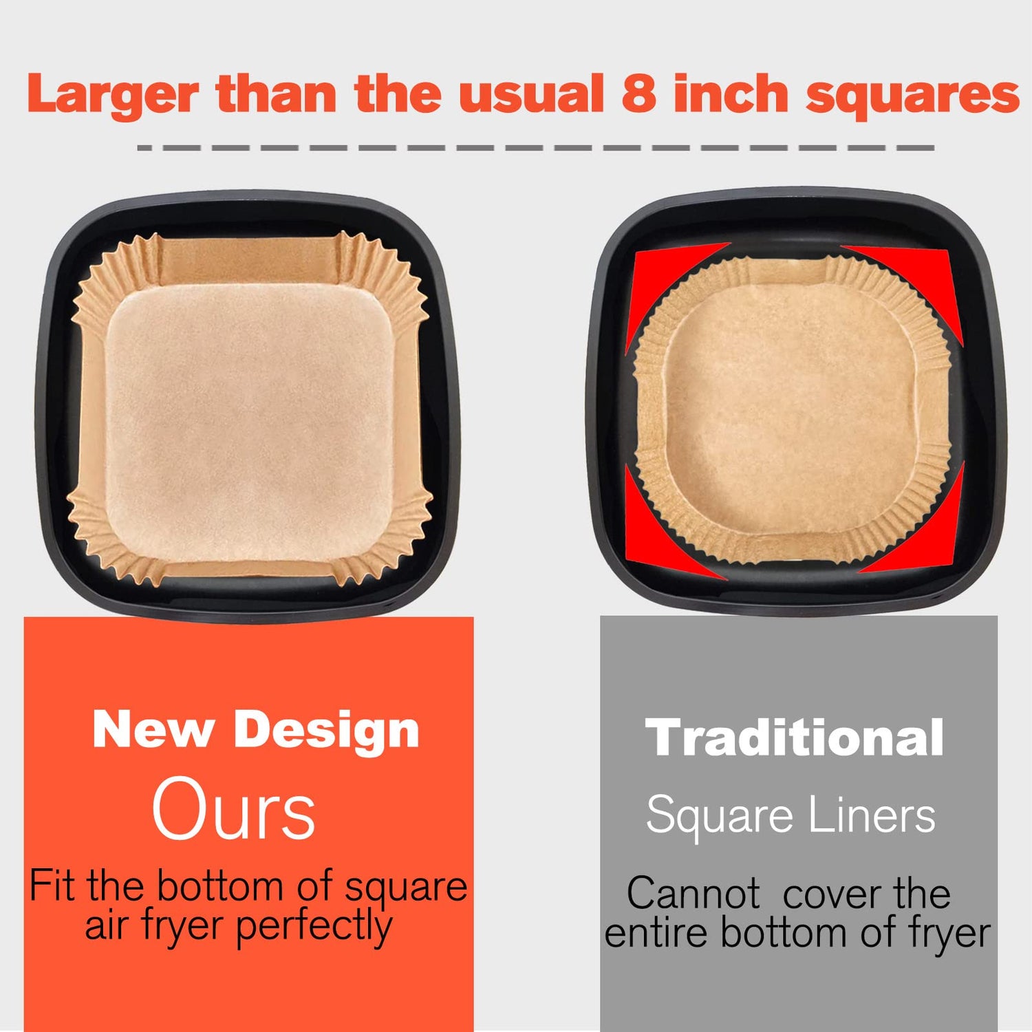 - 【Info】Large Size. 125Pcs. Square air fryer liners disposable are designed with a square bowl shape. Upper size 9 inches, bottom size 8 inches, perfects for 6-10 quart air fryer.