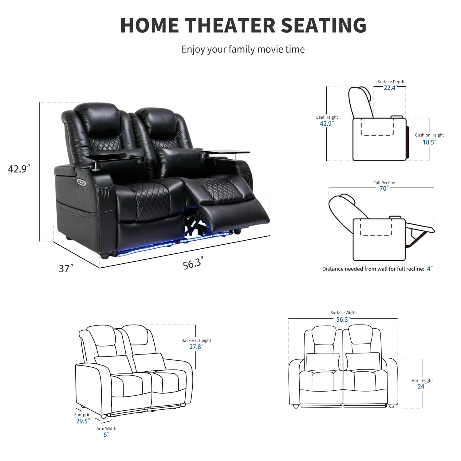 - DIMENSIONS AND SERVICE :Total size – 56.3 (L) * 37 (W) * 42.9 (H) There are 4 boxes in total, please make sure you receive all the boxes before opening and installing. The zero-against-wall feature allows you to place the home theater Loveseat down with only 4 inches left with the wall. If you have any questions, 7*24 professional service team will reply your solution within 24 hours