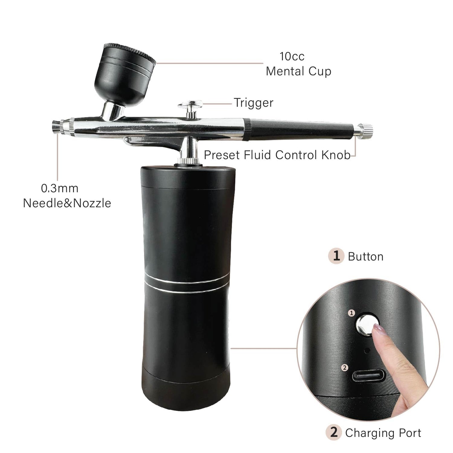 - 【USB charging】The airbrush features a rechargeable battery that Can be used continuously for a long time. Easly charge it via USB with a power bank, laptop, or any USB charger (Type-C). The airbrush body includes an indicator light. Note: Please use a 5V/1A or 5V/2A adapter