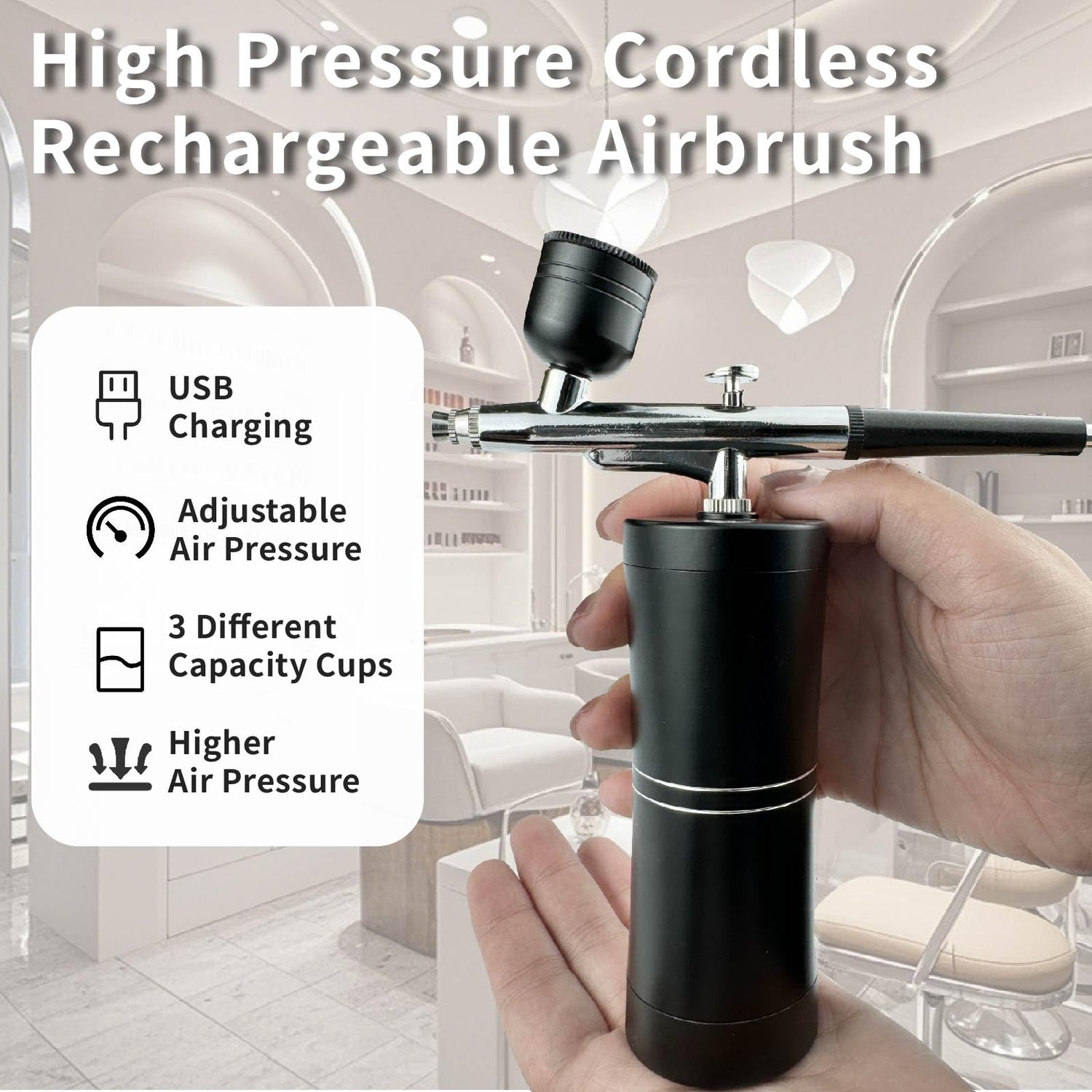 - 【Higher Air Pressure】The airbursh is portable and rechargeable, with auto handheld airbrush gun and compressor. Higher pressure can deliver heavier coating faster in a large range. Widely applicate in paint art, nails art, make-up, facial moisturizing, model painting, Barber, handicraft ect