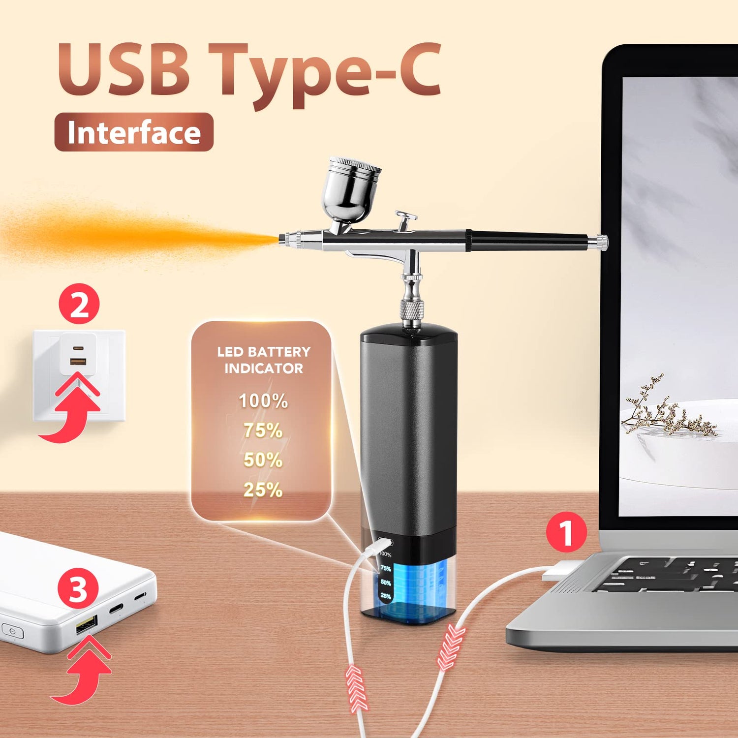 - USB Rechargeable and High-Capacity Battery: Charge our aerografo airbrush machine quickly with USB Type-C fast charging and enjoy up to 1 hour of continuous handheld airbrush kit use.