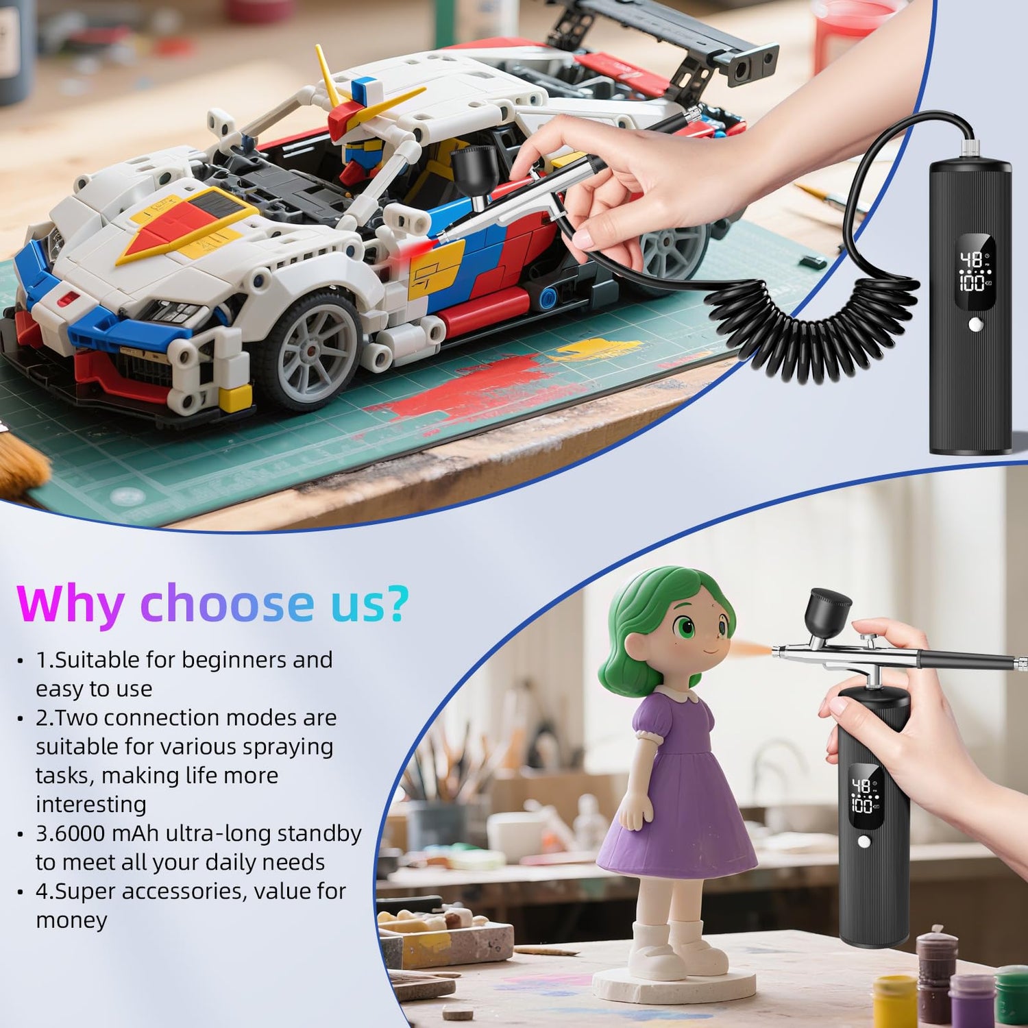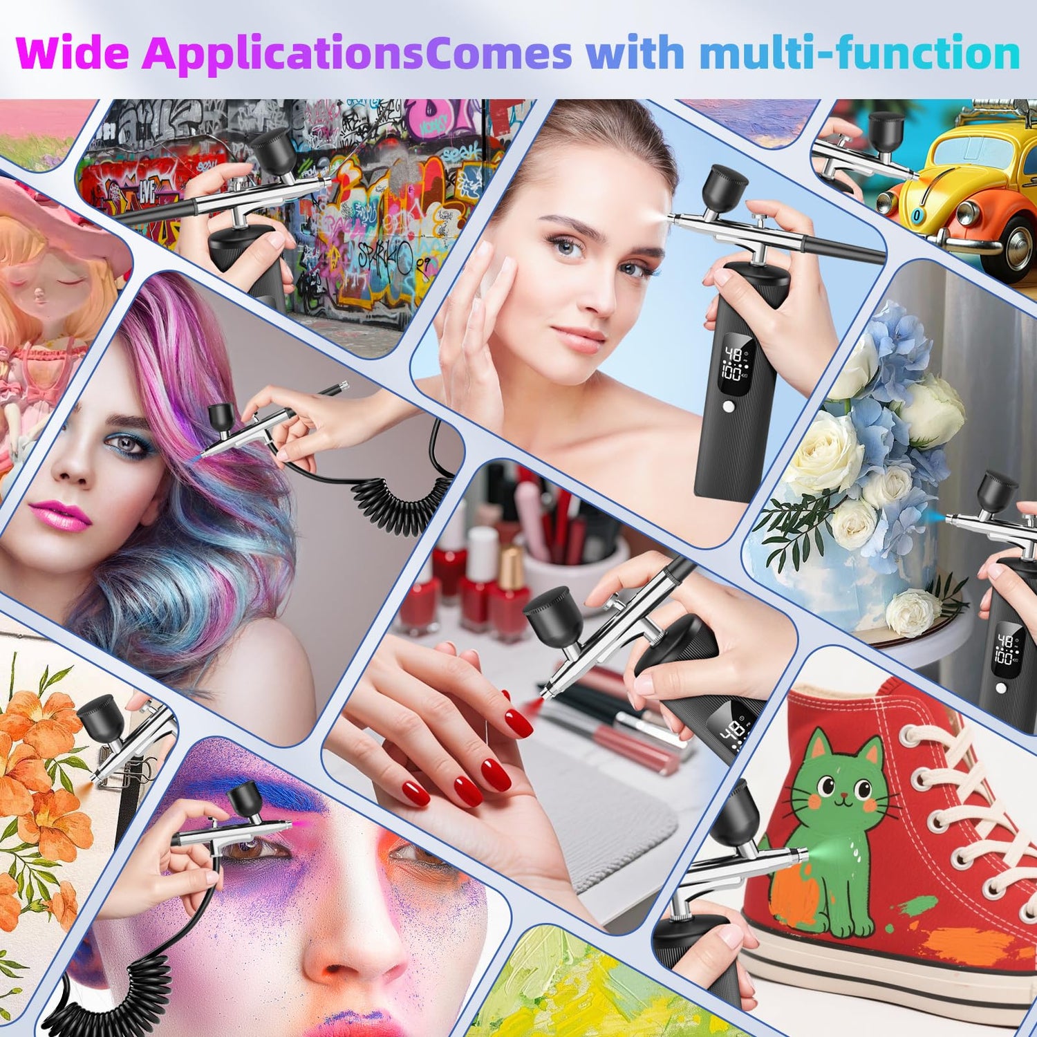 - High Pressure Spray Flow: Airbrush kits featuring 48PSI air pressure and airflow reaching 15L , Upgraded 6000 mAh battery for 100% more standby time,resulting in a 90% performance boost. Suitable for a variety of uses, such as art painting, model coloring, cake decorating, nail art, make-up, beauty and so on
