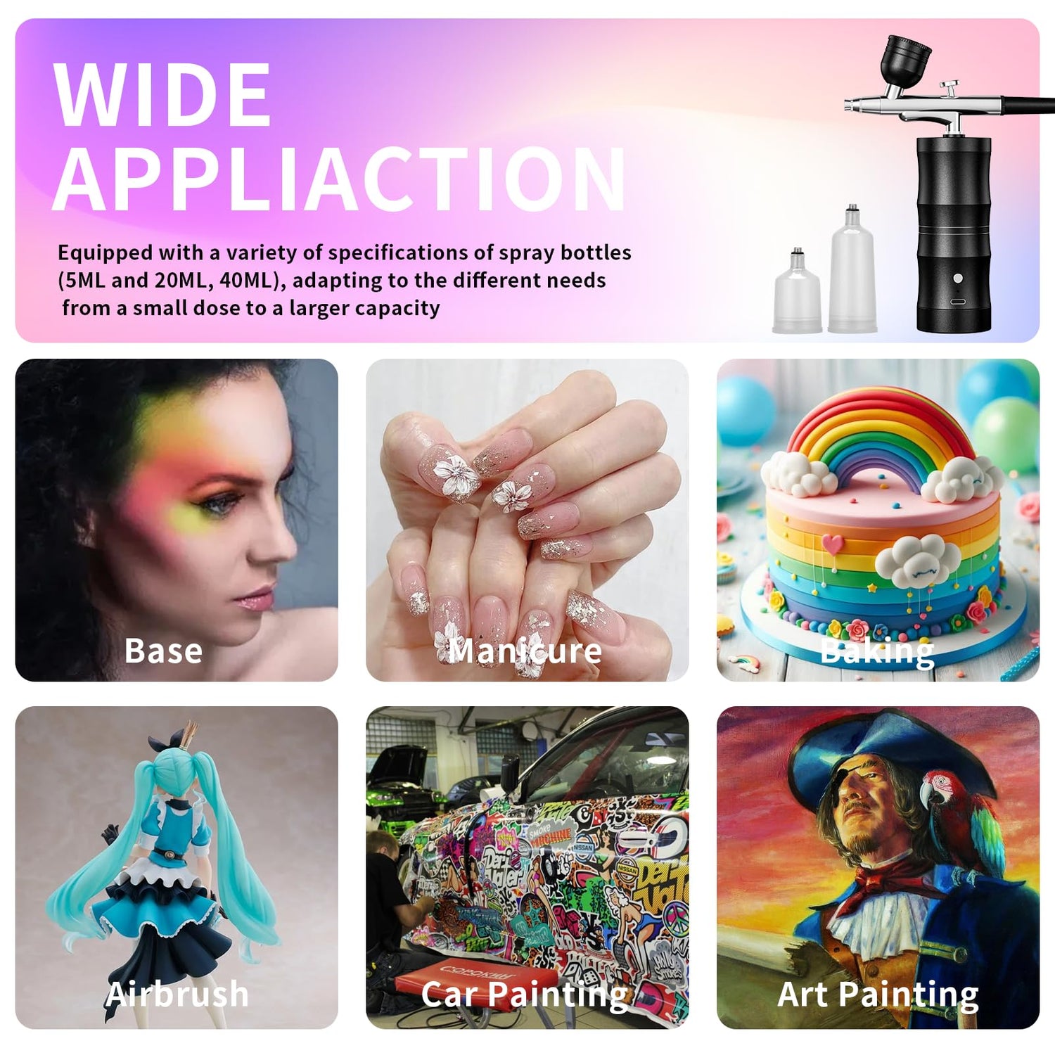 - 【Airbrush Kit with Compressor】With this cordless airbrush kit and its adjustable pressure, you can achieve a variety of effects on any surface. It allows for creating complex fine lines and large area paintings, such as nail art, airbrush makeup, model coloring, hair coloring, cake decoration, graffiti, illustration, and any DIY paint projects.
