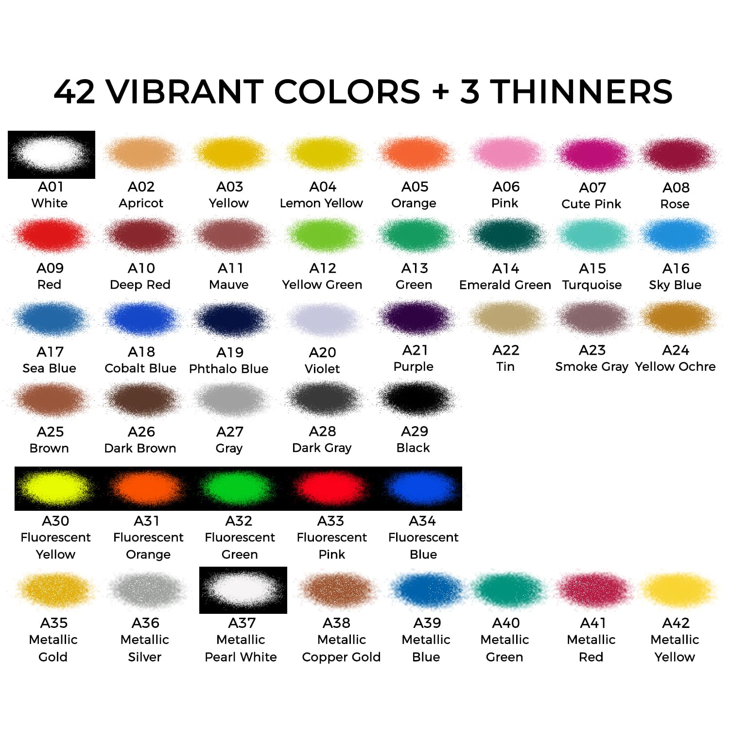 Airbrush Paint, ARTME 42 Colors with 3 Thinner, Ready to Spray, Opaque & Water Based Acrylic Airbrush Paint Set Including Metallic & Neon Colors, Premium Air brush Paints for Metal, Models, Plastic, Canvas, and Wood