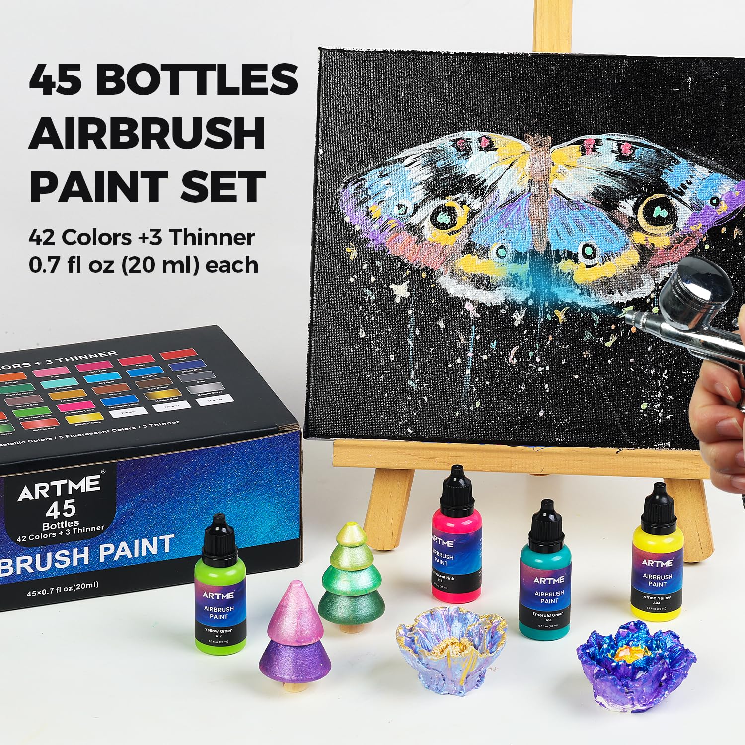- AIRBRUSH PAINT SET: ARTME airbrush paint kit has 42 vivid colors: 29 classic opaque colors, 5 Neon Colors, 8 Metallic colors and 3 Thinner. Perfect as a rich color airbrush paint set, totally meets most of your painting needs with brilliant visual color results. Each bottle is 20 ml/0.7 fl oz.
