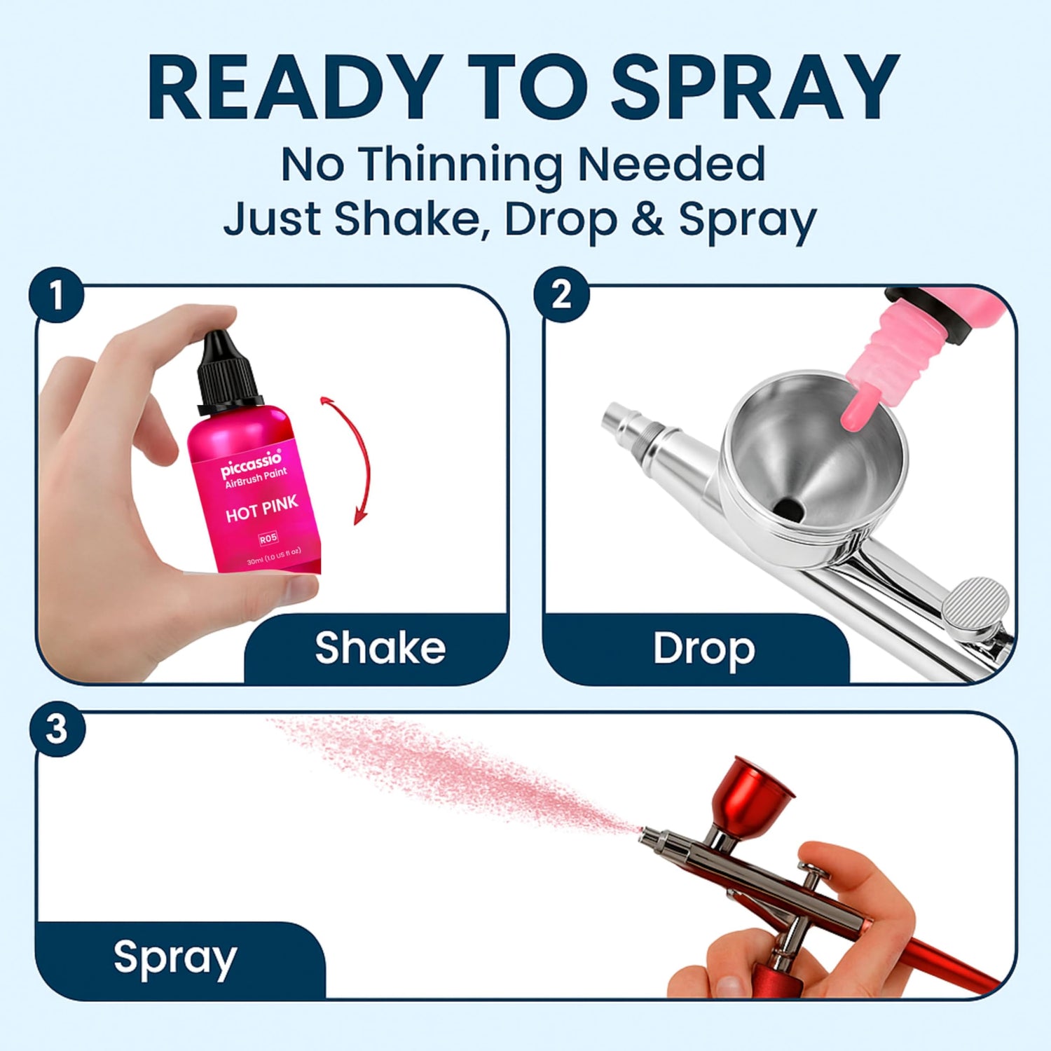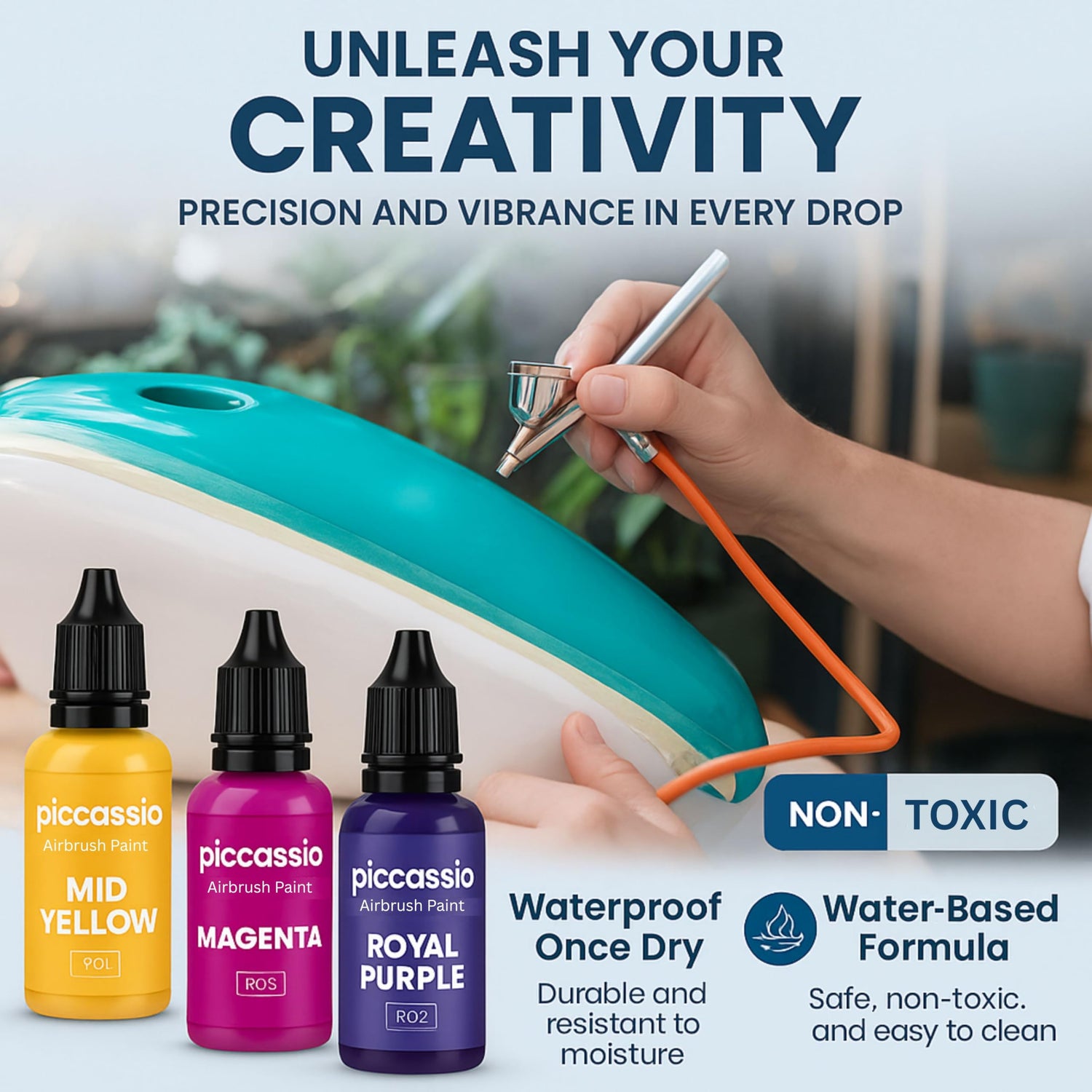 Details: Introducing the Piccassio Airbrush Paint Set, a premier collection of airbrush painting supplies designed for artists, hobbyists, and professionals alike. This comprehensive spray paint set is meticulously crafted to deliver exceptional performance and vibrant results for a variety of applications. Whether you're a seasoned artist or a beginner exploring the world of airbrushing, our airbrush paint set offers unparalleled versatility and quality. Our airbrush paint set includes a wide array of colors, from rich metallic airbrush paint to subtle airbrush makeup colors, ensuring you have the perfect tones for every project. The acrylic airbrush paint formulation provides a smooth, even application, making it ideal for model spray paint, airbrush face painting kit, or even creating stunning airbrush body paint designs. The set also features water based airbrush paint, perfect for those who prefer an eco-friendly option without compromising on vibrancy or adhesion. Each paint in the air brush painting set is carefully prepared to be airbrush thinner for acrylic paint compatible, ensuring seamless integration into your creative process. Our airbrush paints are renowned for their durability and consistent pigmentation, making them an excellent choice for airbrush nail paint and airbrush body paint for skin. The inclusion of gel airbrush paint for nails adds a sophisticated touch to your nail art endeavors, with colors that are both striking and long-lasting. For those venturing into model airbrush paint or seeking the precision of a picasso airbrush, our airbrush paint kit provides everything you need. The aerógrafo para pintura acrílica ensures a flawless application, whether you're working on intricate details or expansive projects. With the addition of airbrush colors for nails and tamiya airbrush paint, the possibilities are endless. This airbrush face paint collection is both comprehensive and user-friendly, making it the perfect choice for artists of all levels. From airbrush paint for nails to the robust army painter set for miniatures, this model air brush paint kit is the ultimate tool for your artistic journey. Explore the world of air brush paints acrylic ready to spray, and let your creativity soar with our Createx Airbrush Paint Set.