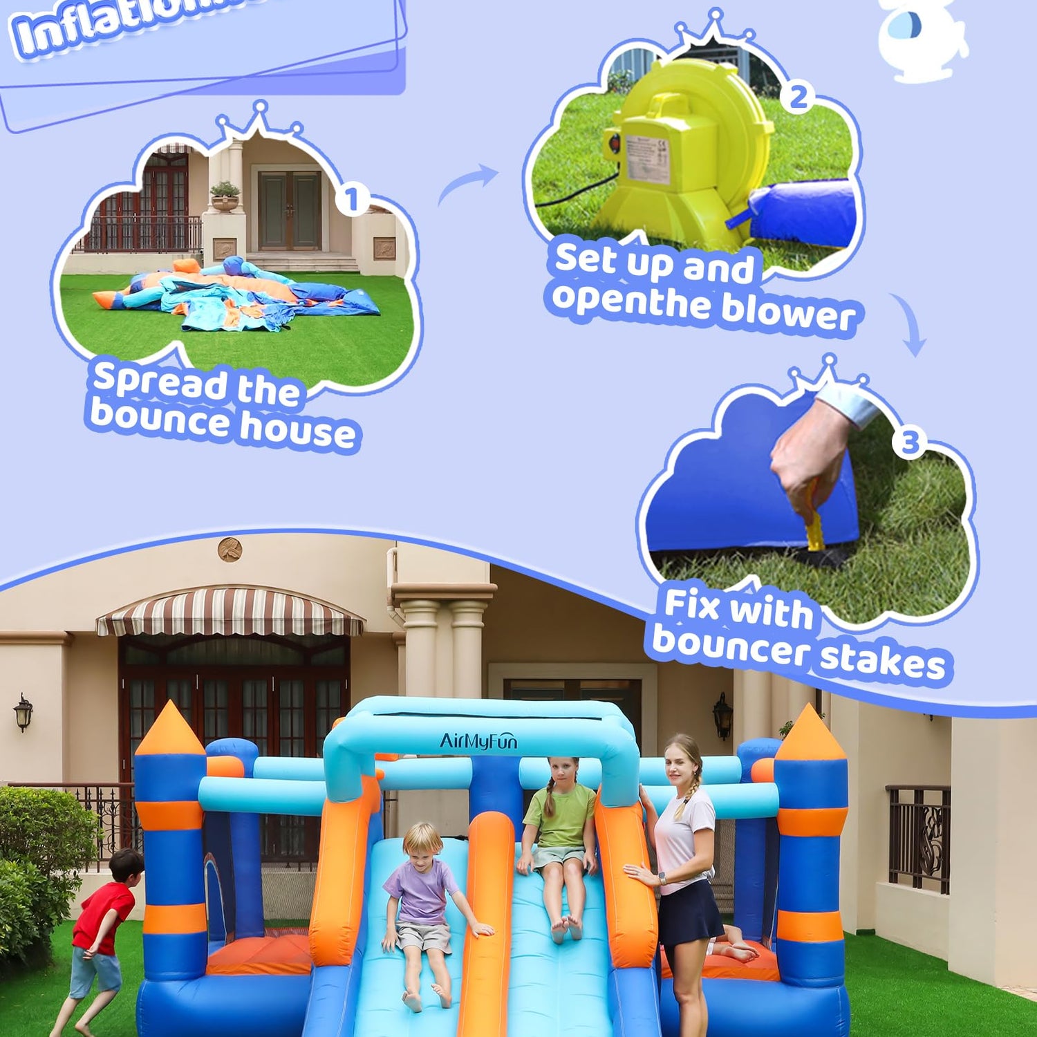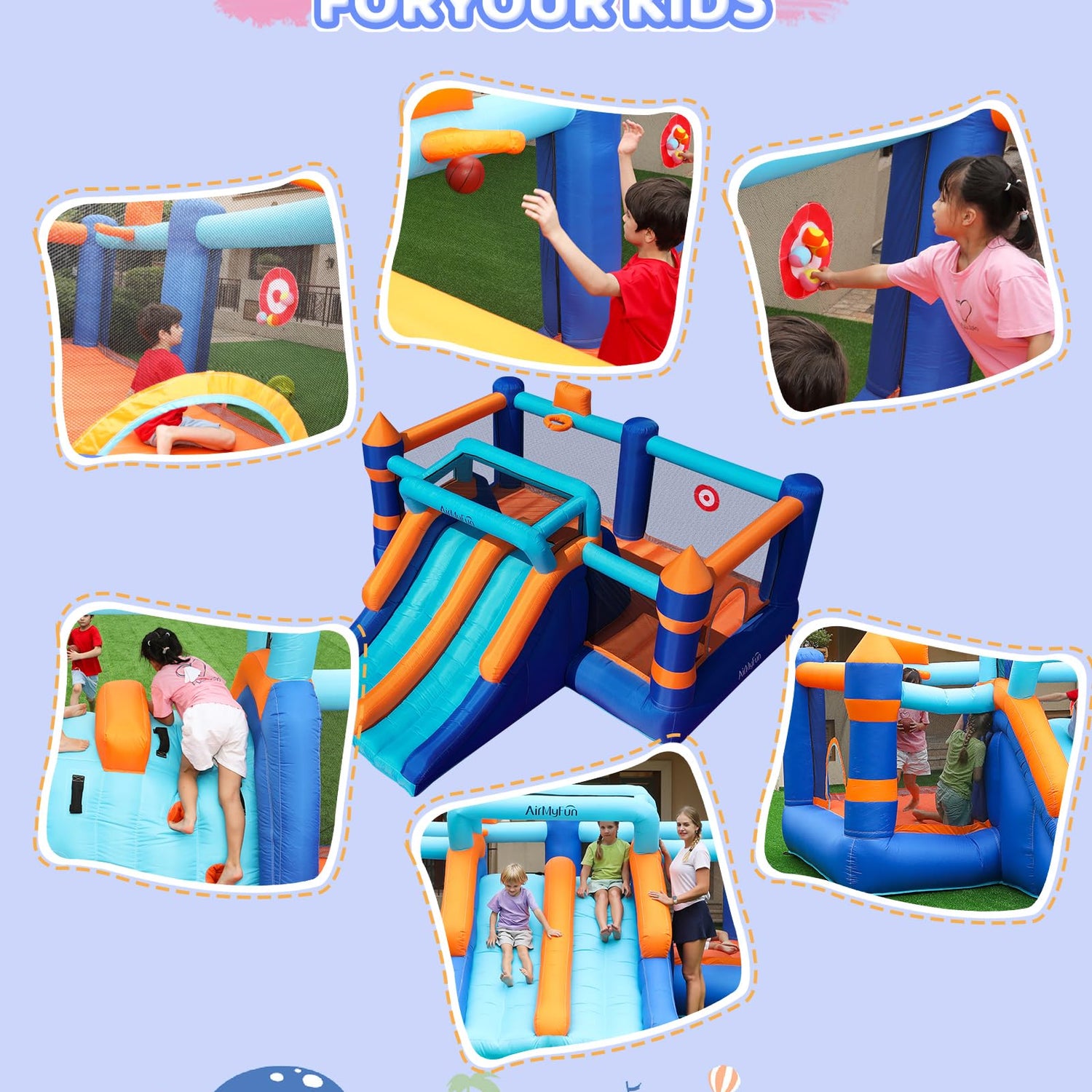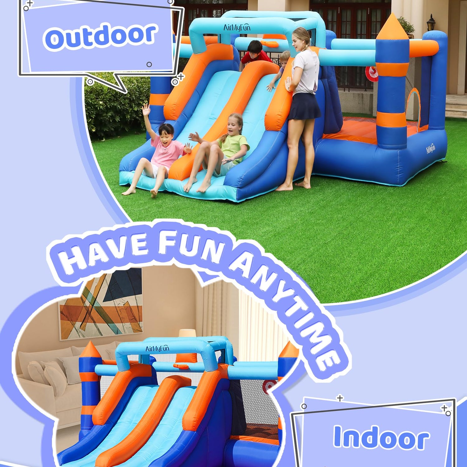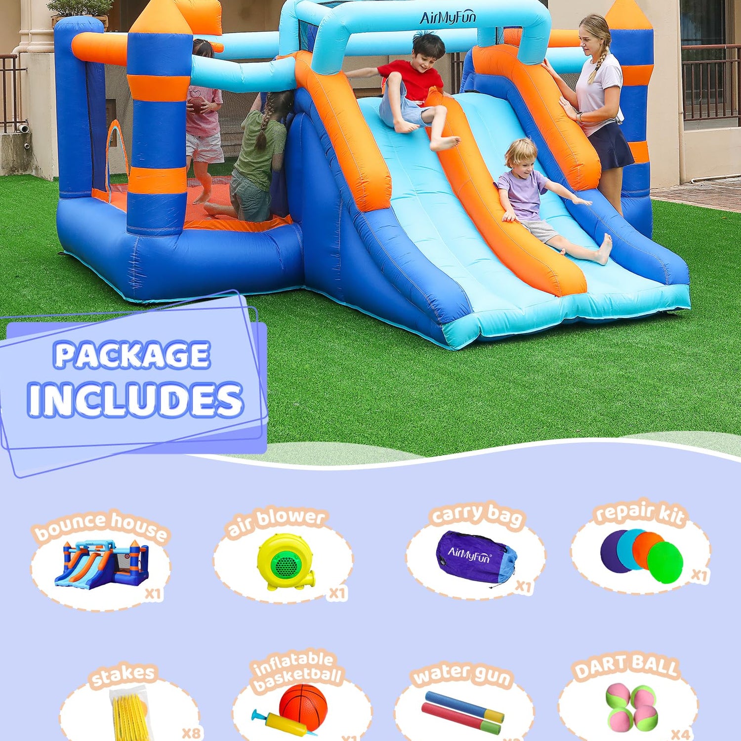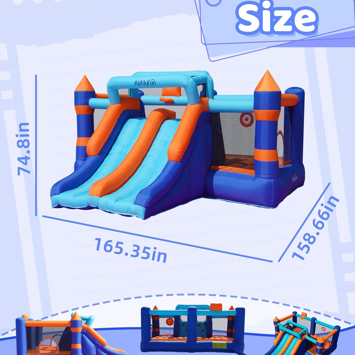 AirMyFun Inflatable Bounce House, Bouncy House with Double Slide,Jumping Bouncing House, Bounce Castle for Kids Indoor Outdoor, Playhouse with Basketball Rim, Pitching Game
