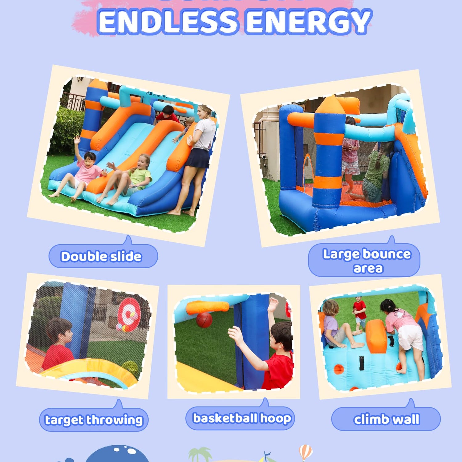 - 【DOUBLE SLIDING FUN 】- Let your kids jump, slide and bounce freely in this bounce house! Indoor and outdoor party bouncy castle designed for kids to play with their friends. In the bouncy castle, kids can have fun in the spacious bouncing area, where every jump and shot requires constant postural adjustments to maintain balance. There are also two inflatable slides of the same height for children to play and compete on at the same time, adding extra excitement to this bouncy castle!