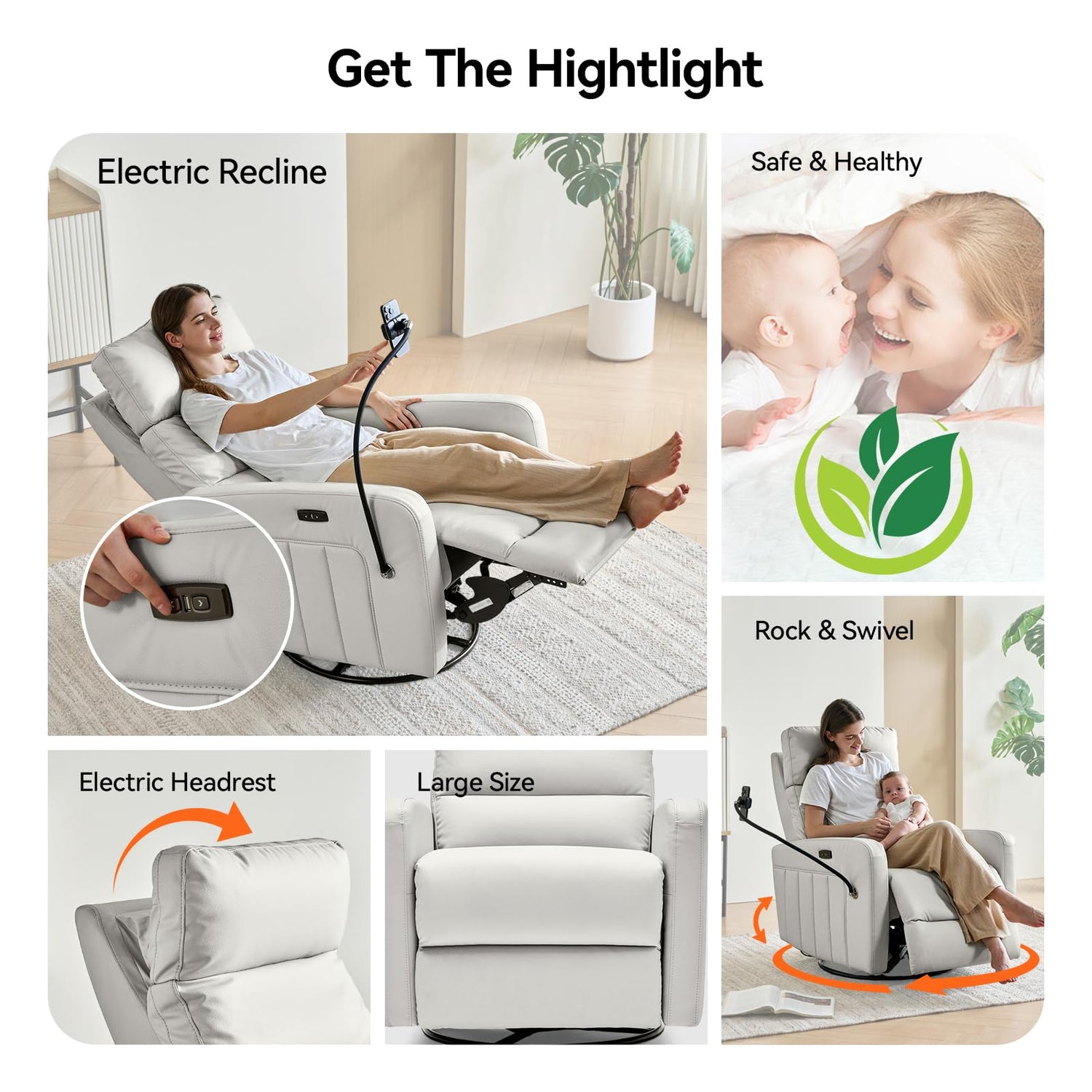 AIRSKY Power Recliner Chair, Oversized Swivel Rocker Recliner, Electric Recliner Chairs for Adults, Nursery Rocking Chairs, Lazy Boy Recliner Chair, P2 (Gray White)