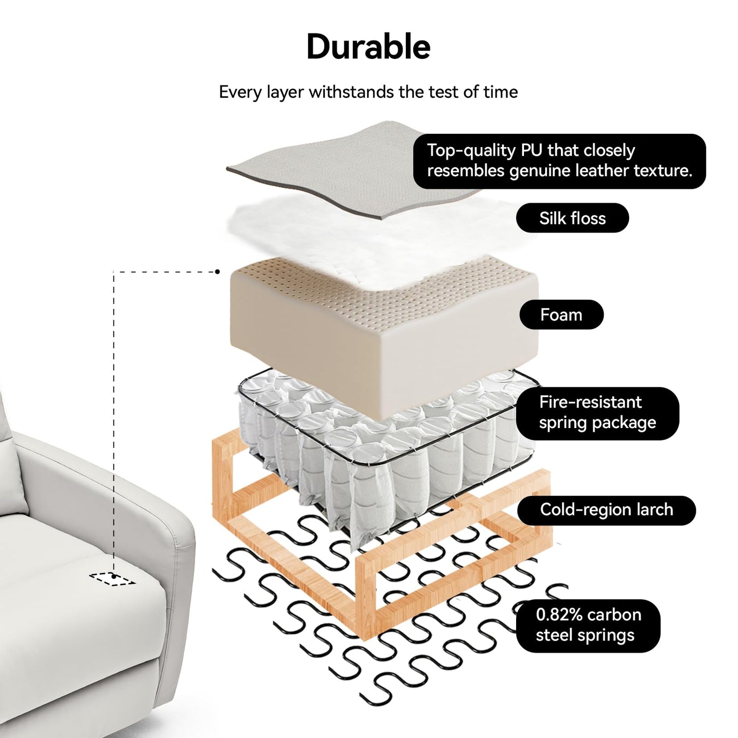 - The seat cushion features four layers.:The contact layer is made of eco-friendly ultra-soft synthetic leather; the comfort layer uses silk floss and high-density eco-friendly foam; the resilience layer uses high-density fire-resistant springs; and the support layer is built with 0.82% carbon steel springs.