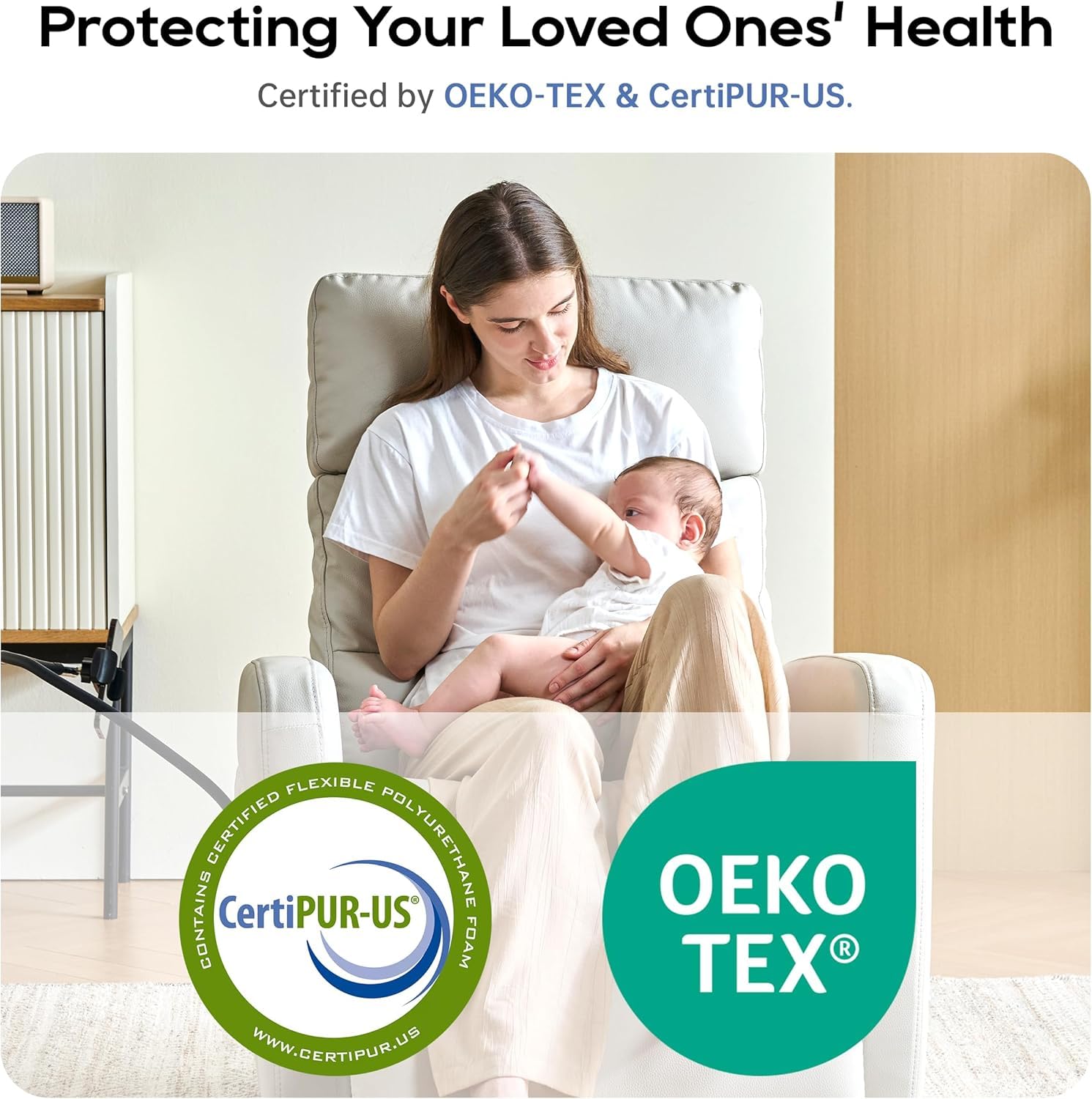 - Three Safety Certifications: The rocking chair nursery is made from eco-friendly and healthy materials, including eco-friendly ultra-soft synthetic leather, formaldehyde-free foam, and cold-region larch. The foam of nursery rocking chairs has passed OEKO-TEX and CertiPUR-US certifications, while the genuine leather of glider rocking chair is SGS-certified. In contrast, inferior functional nursery chair often use powder-mixed foam to enhance softness and low-quality synthetic wood for the frame, which poses potential safety risks despite similar appearances.