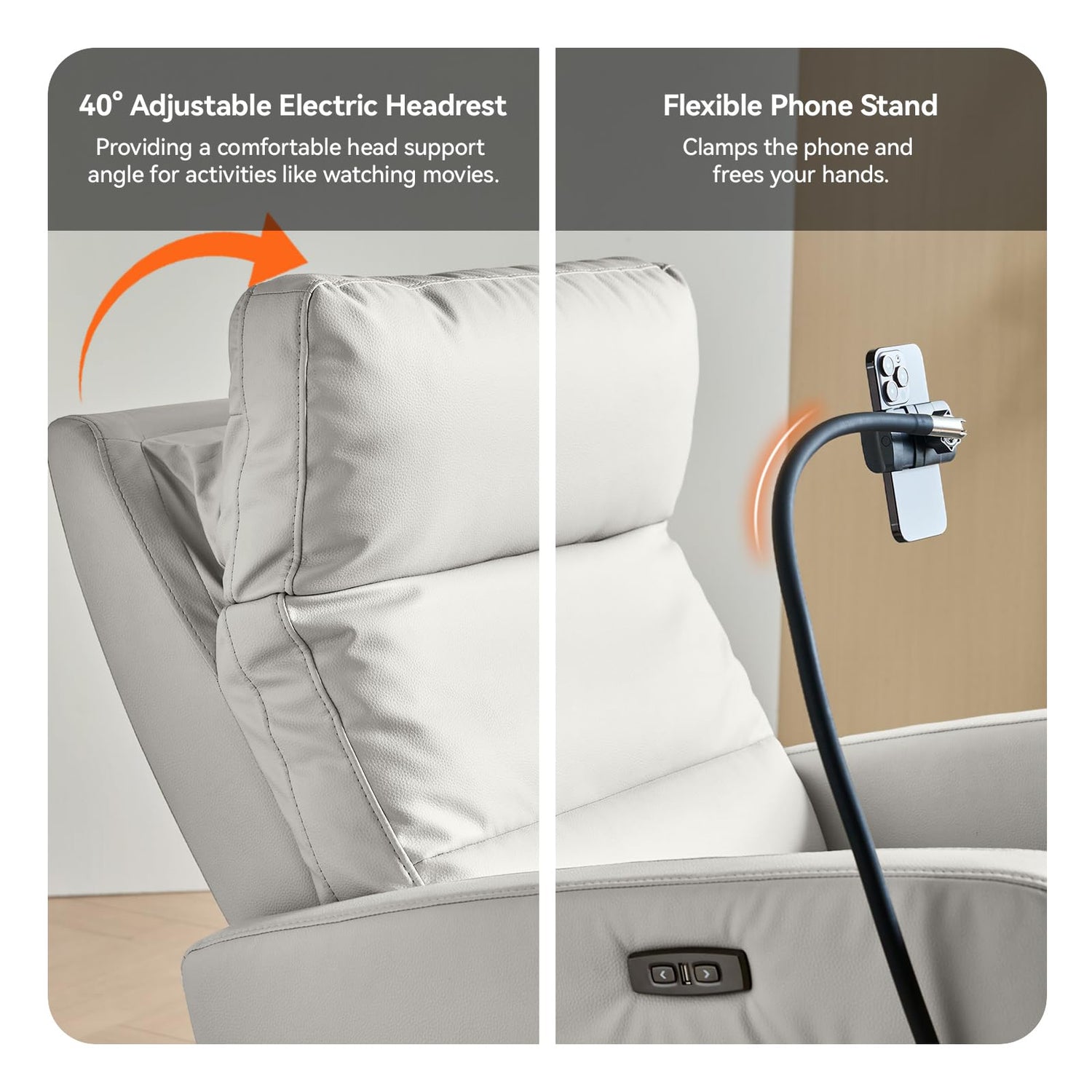 - Power Recliners Chair: The 0-40° adjustable headrest allows you to find the perfect angle for watching movies or playing games, ensuring optimal head support. Additionally, the backrest and leg rest angles can be adjusted and locked in place via buttons. The power recliner chairs for adults built-in USB port keeps you free from cable limitations.