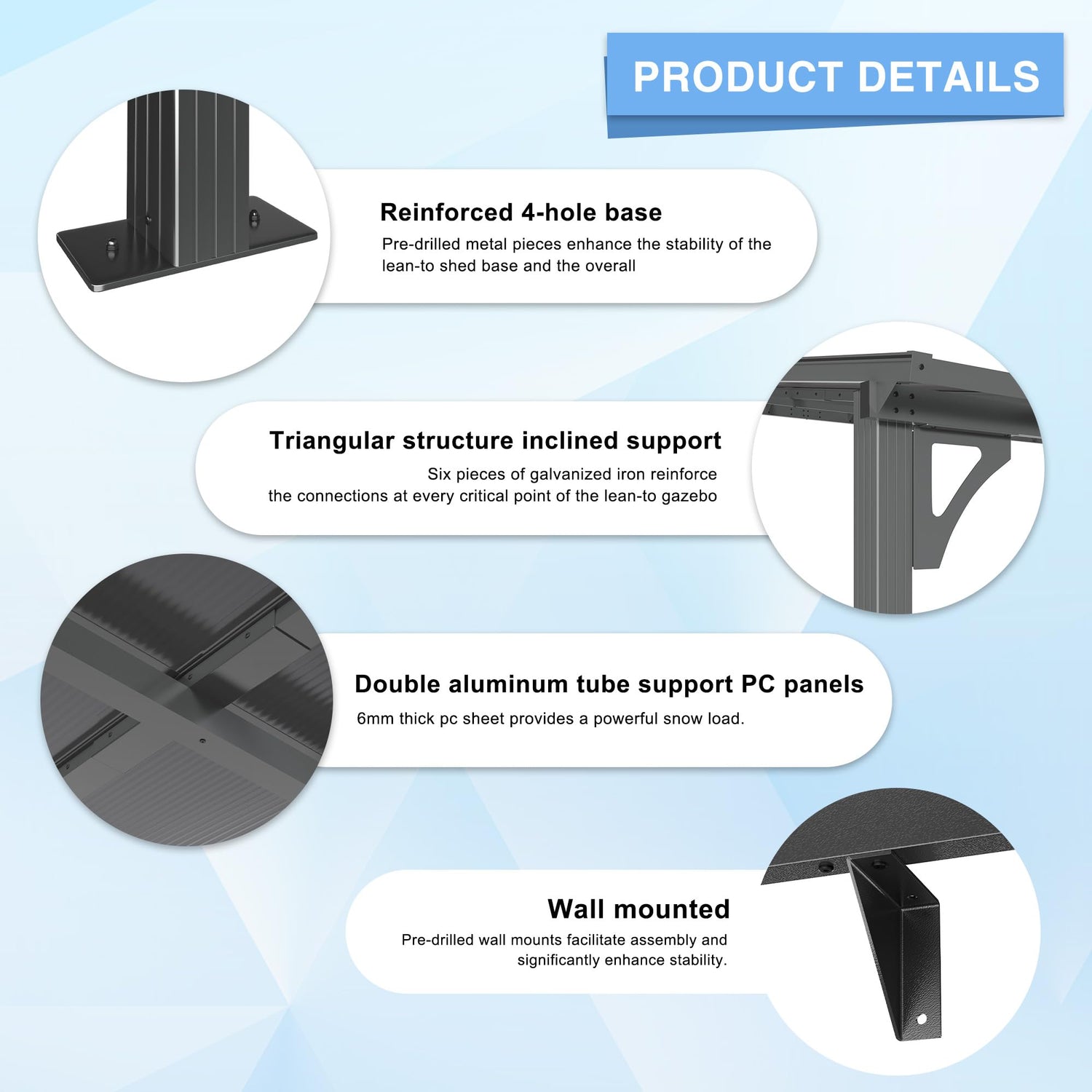 - [Premium Roof Sheet and Personalized Design] This patio awning is designed for stability and strength, with armor-grade roof sheets. Metal gazebo are 6 times thicker than normal roof sheets, triangular steel reinforcements and cross-braced top tubes increase stability by 50% over standard pergolas. In addition, sunroom polycarbonate top provides UV protection by reflecting 99% of UV rays