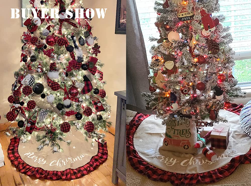 AISENO 48 Inch Christmas Tree Skirt Linen Burlap Buffalo Plaid Edge Decoration for Merry Christmas Party Red and Black Buffalo Christmas Tree Skirt Decorations