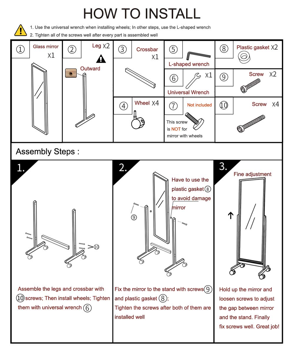 • 360 Deree Rotation - 360 degree rotation design makes it easy to adjust to any suitable angle. With the 4 Omni-directional wheels at the bottom of the floor mirror, you can move and place it anywhere you like.