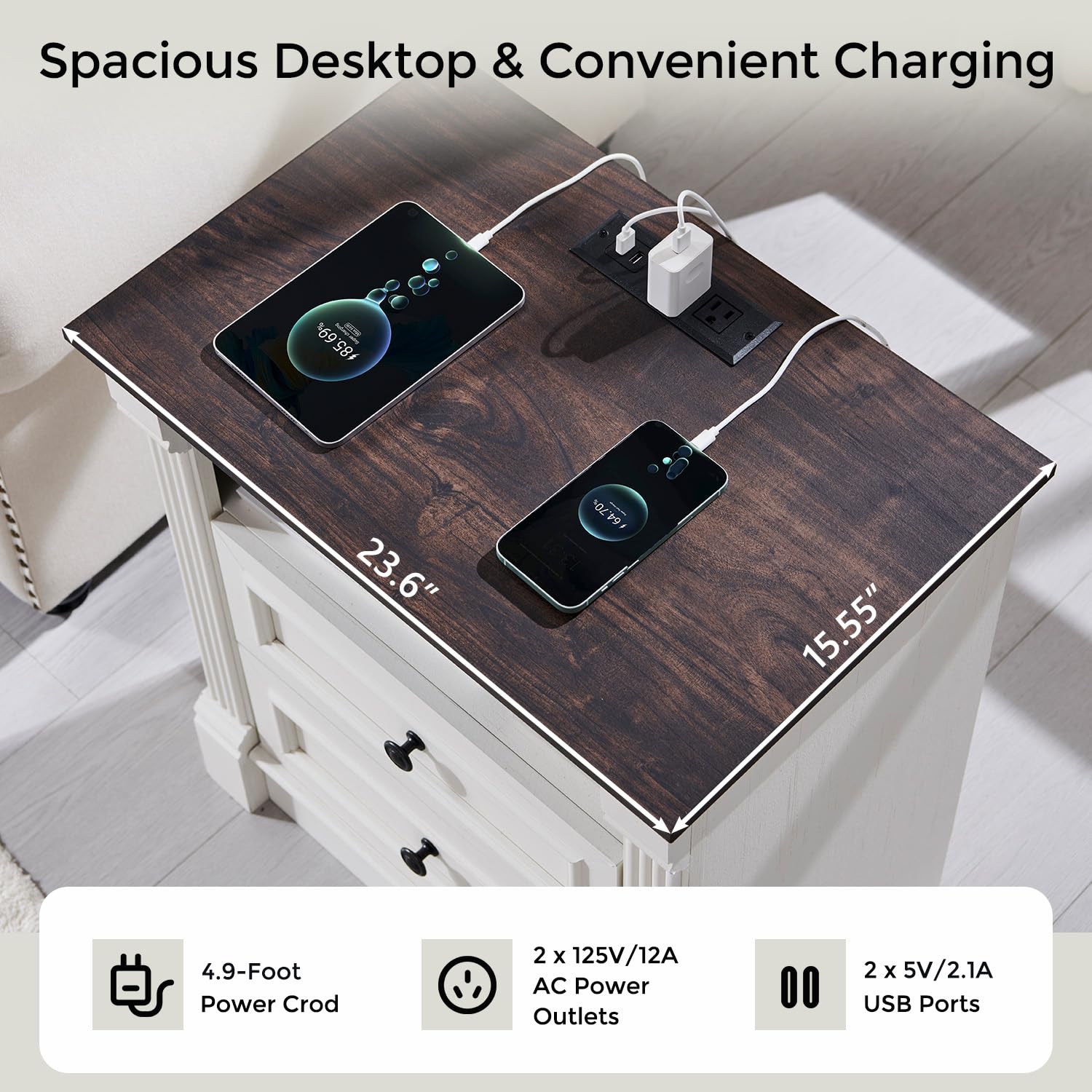 - CONVENIENT CHARGING STATION: Farmhouse nightstand featuring a built-in charging station. Equipped with 2 USB ports and 2 AC power outlets, it ensures your devices are always charged and ready to go. The back panel includes a 2.3-inch diameter cable management hole, keeping your space neat and organized. With a spacious tabletop, you have plenty of room for your essentials and favorite decor