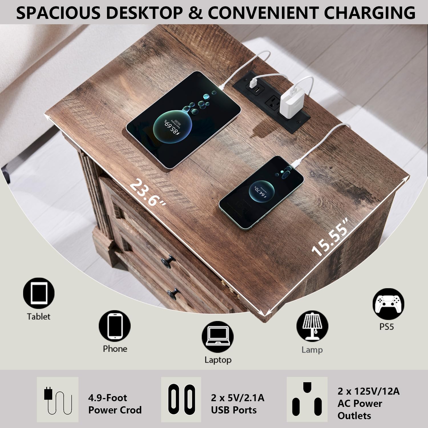 - CONVENIENT CHARGING STATION: Farmhouse nightstand featuring a built-in charging station. Equipped with 2 USB ports and 2 AC power outlets, it ensures your devices are always charged and ready to go. The back panel includes a 2.3-inch diameter cable management hole, keeping your space neat and organized. With a spacious tabletop, you have plenty of room for your essentials and favorite decor