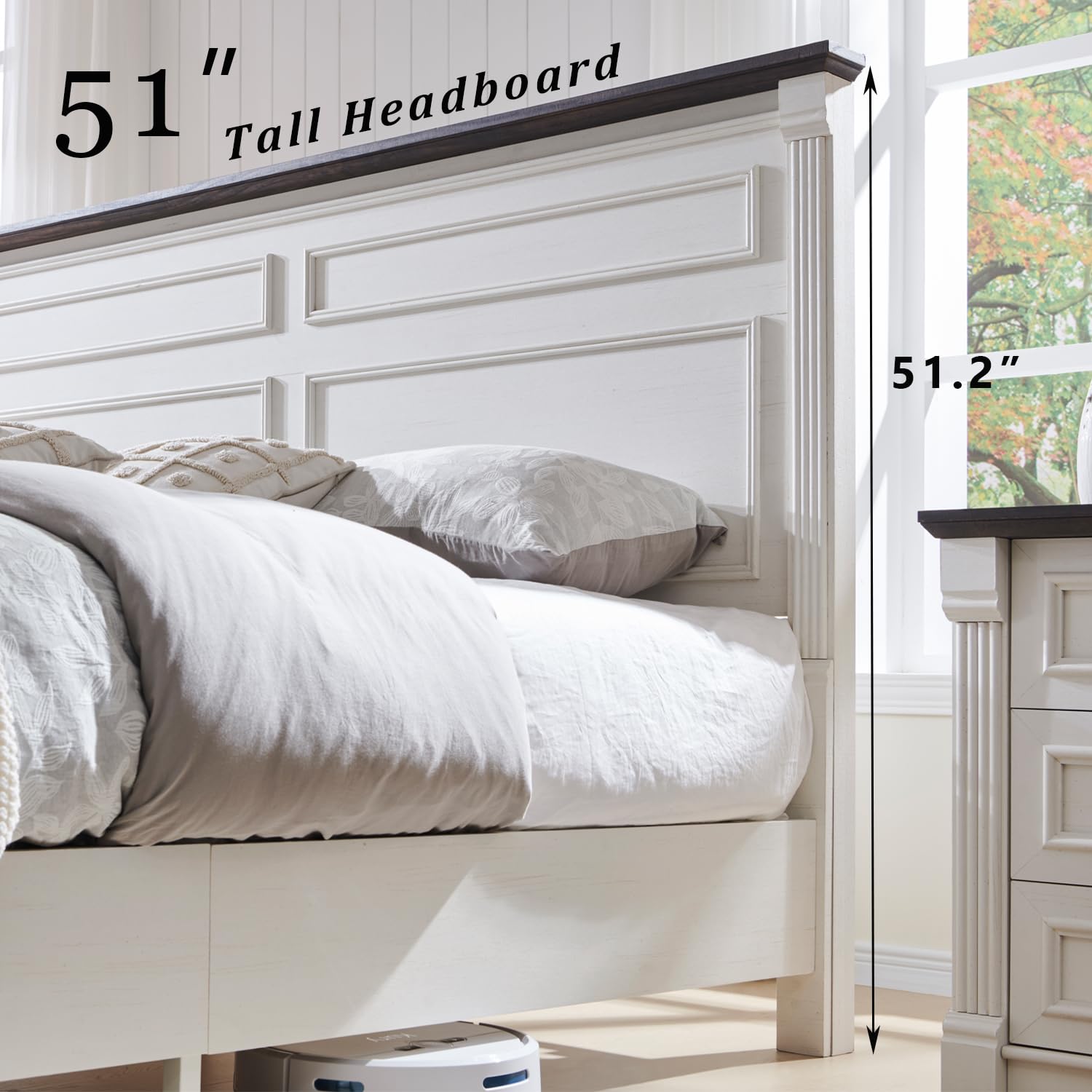 Aitjunz Farmhouse King Size Bed Frame with 51" Tall Headboard, Wood Platform Bed Frame with 20" Tall Roman Column Decoration Footboard & 3 Large Storage Drawers, No Box Spring Needed (White)