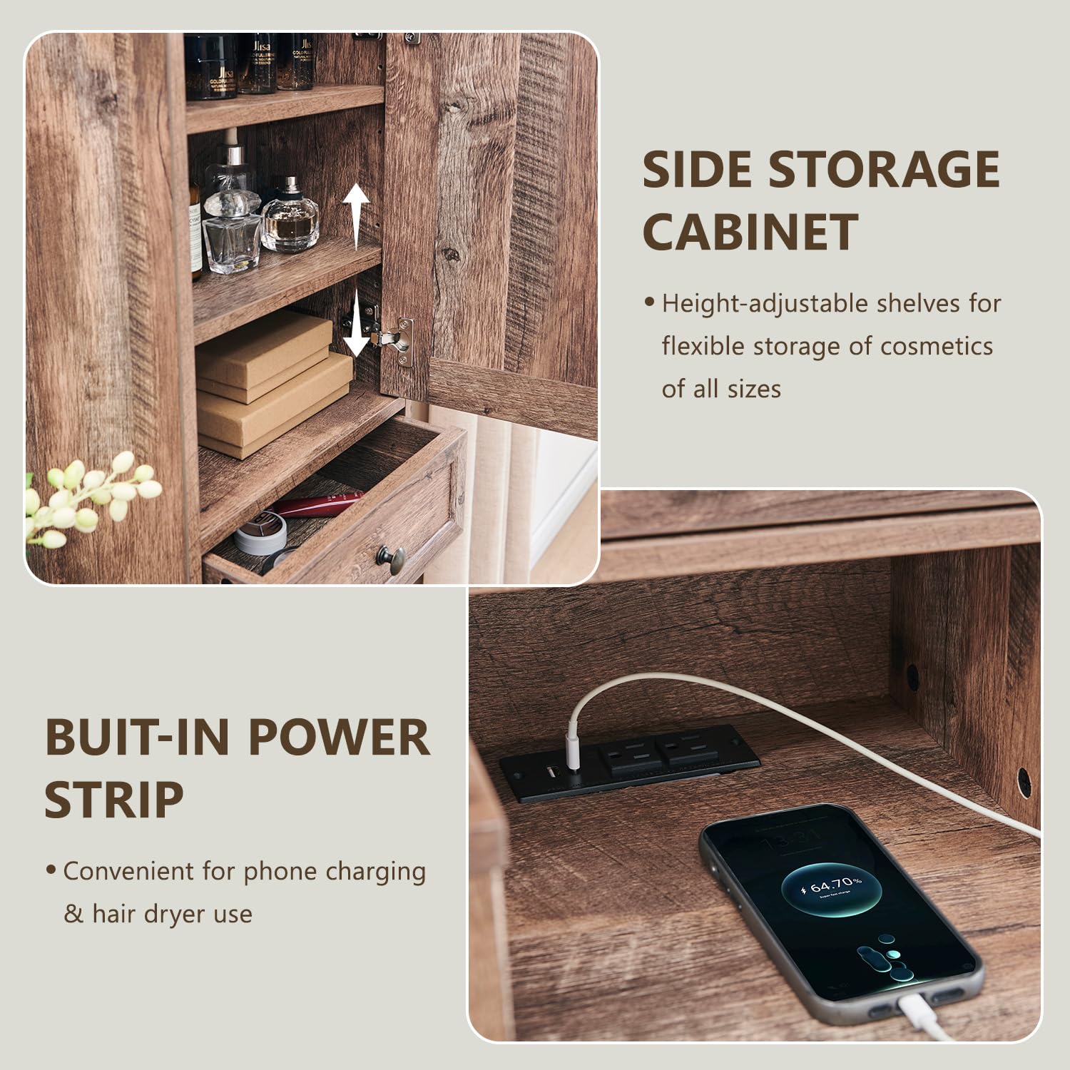 Aitjunz Farmhouse Vanity Desk with Touch Screen LED Mirror, 47" Big Make Up Table with 6 Drawers, Glass Top, Charging Station, Rustic Wood Dressing Table w/3 Color Available, Light Brown