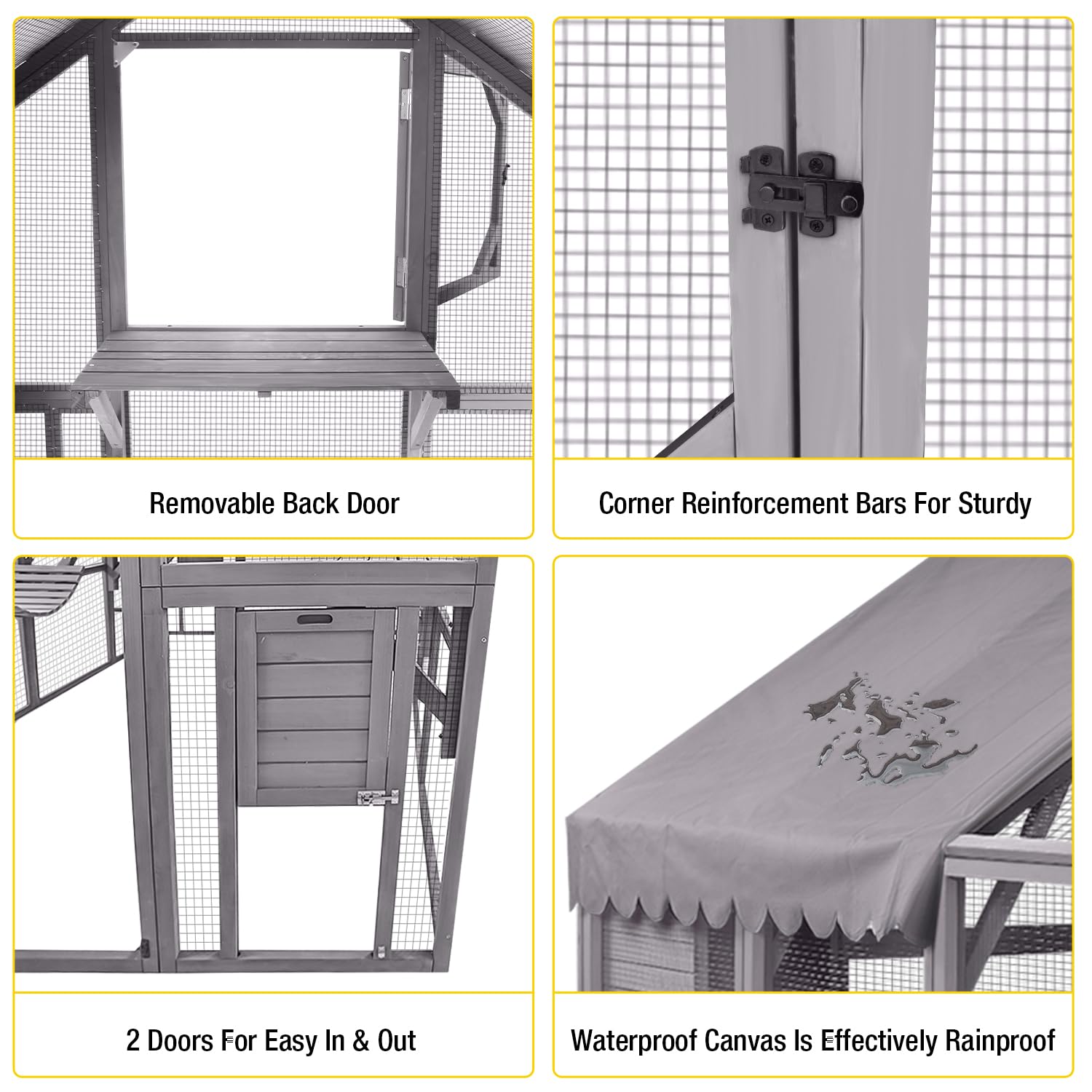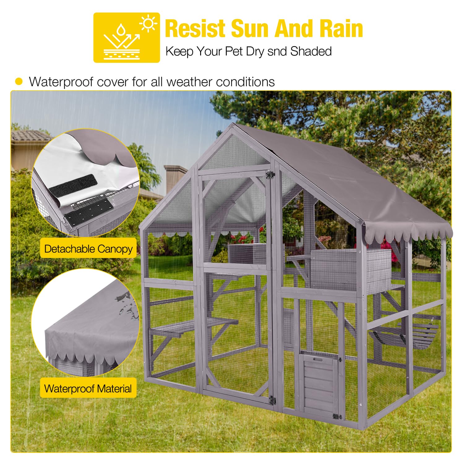 - Quality materials, strong construction: This Catio is made of high-quality fir wood for a stable and durable structure. Cats with thickened oxford cloth provide cool shade on sunny days and are rain-proof and waterproof. The exterior structure features easy-to-bite galvanized wire mesh that can withstand sun and rain, keeping predators out and keeping pets safe. Provide your furry friend with more space to climb and play, both as a safe house and as an activity center to enjoy the outdoors.