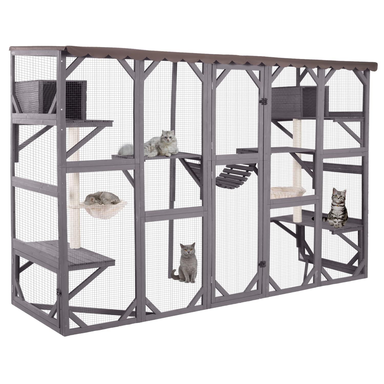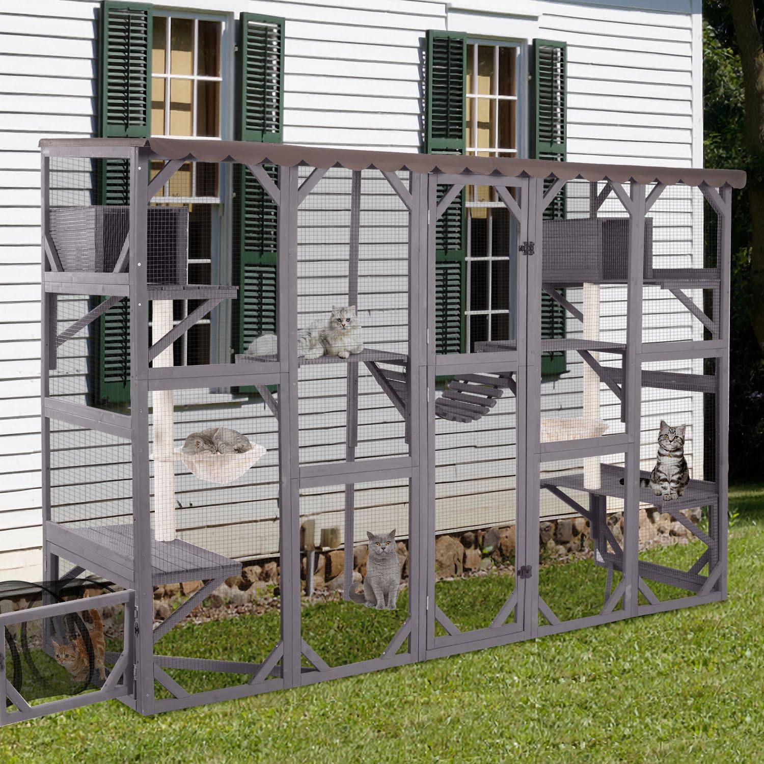 - Spacious and Multi-Level Design:Our large catio provides a spacious living area for your feline friends, featuring dimensions of 104.33" L x 69.45" W x 63.66" H. The multi-level design includes platforms, a cat bed, scratching post, and a cat condo, offering plenty of space for your cats to play, rest, and explore
