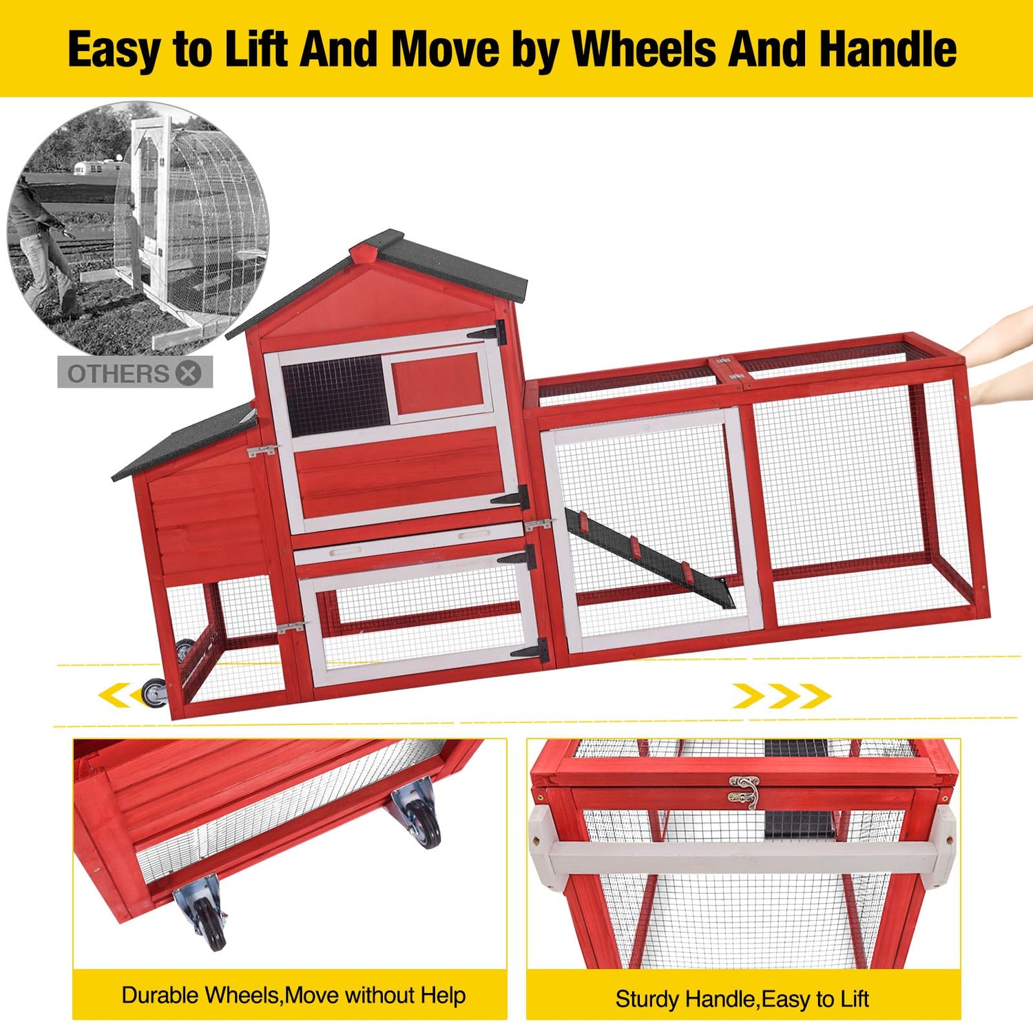 - Easy Movement: 2 quality wheels with long design handle makes this backyard chicken house easily movable.