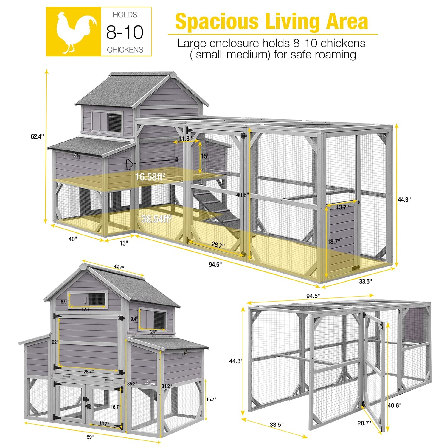 - Easy To Clean: Comes with large removable sliding trays for easy cleaning. Easily reach all areas of the hen coop with SIX access areas. Three screened ventilation windows at the sleeping shelter for good ventilation