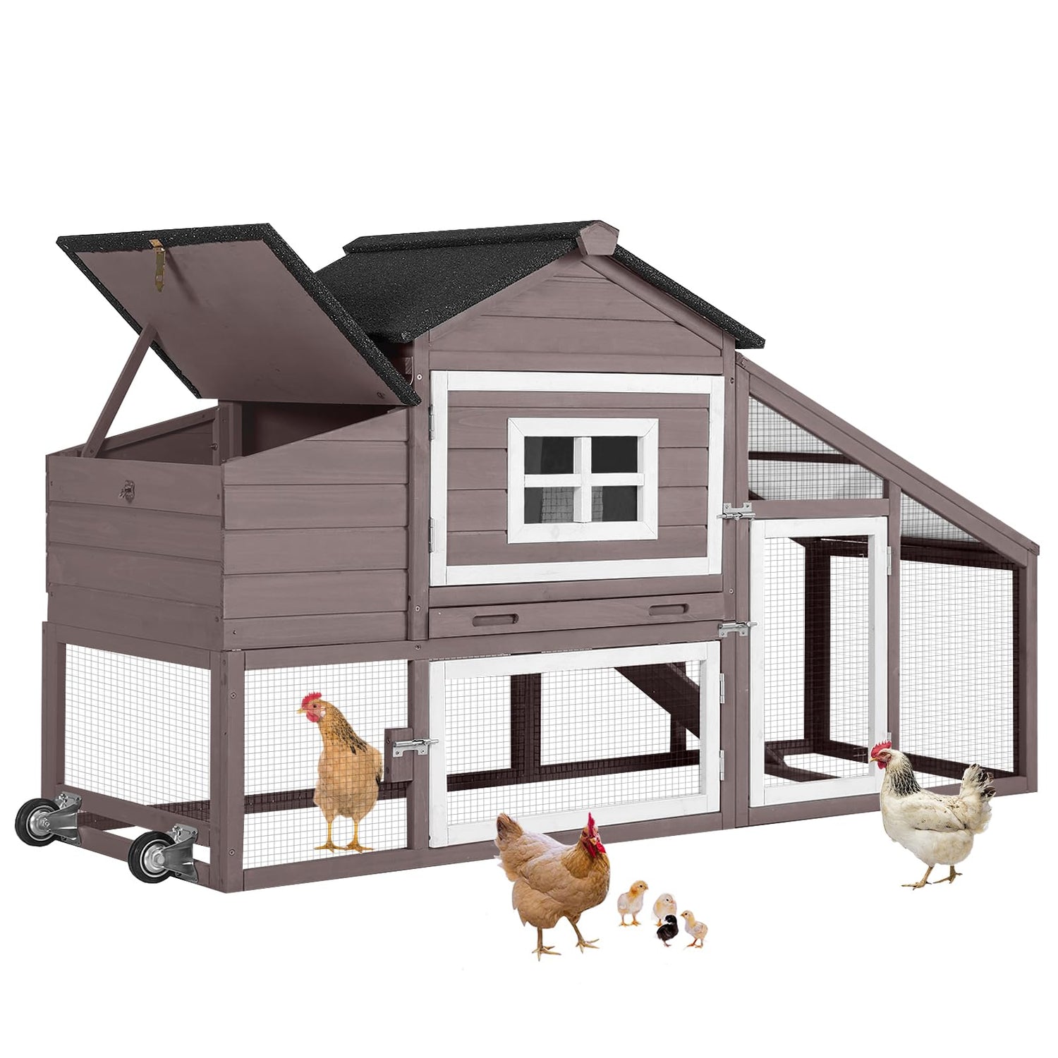 Aivituvin Chicken Coop Outdoor with Wheels, Mobile Hen House Wooden Poultry Cage with Run & Waterproof Roof (Grey with White)