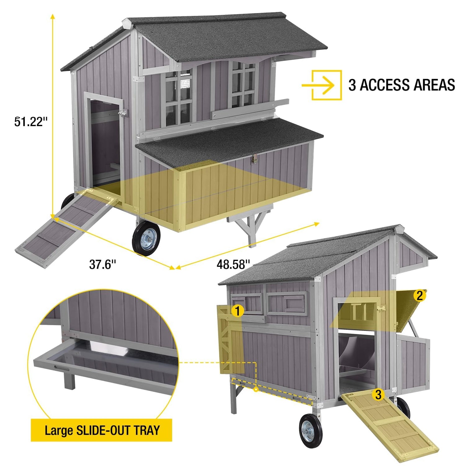 Aivituvin Chicken Coop Upgrade Durable Outdoor Chicken House with Large Wheels, Nesting Box, Leakproof Pull-on Tray and UV-Resistant Roof Panel (Grey)