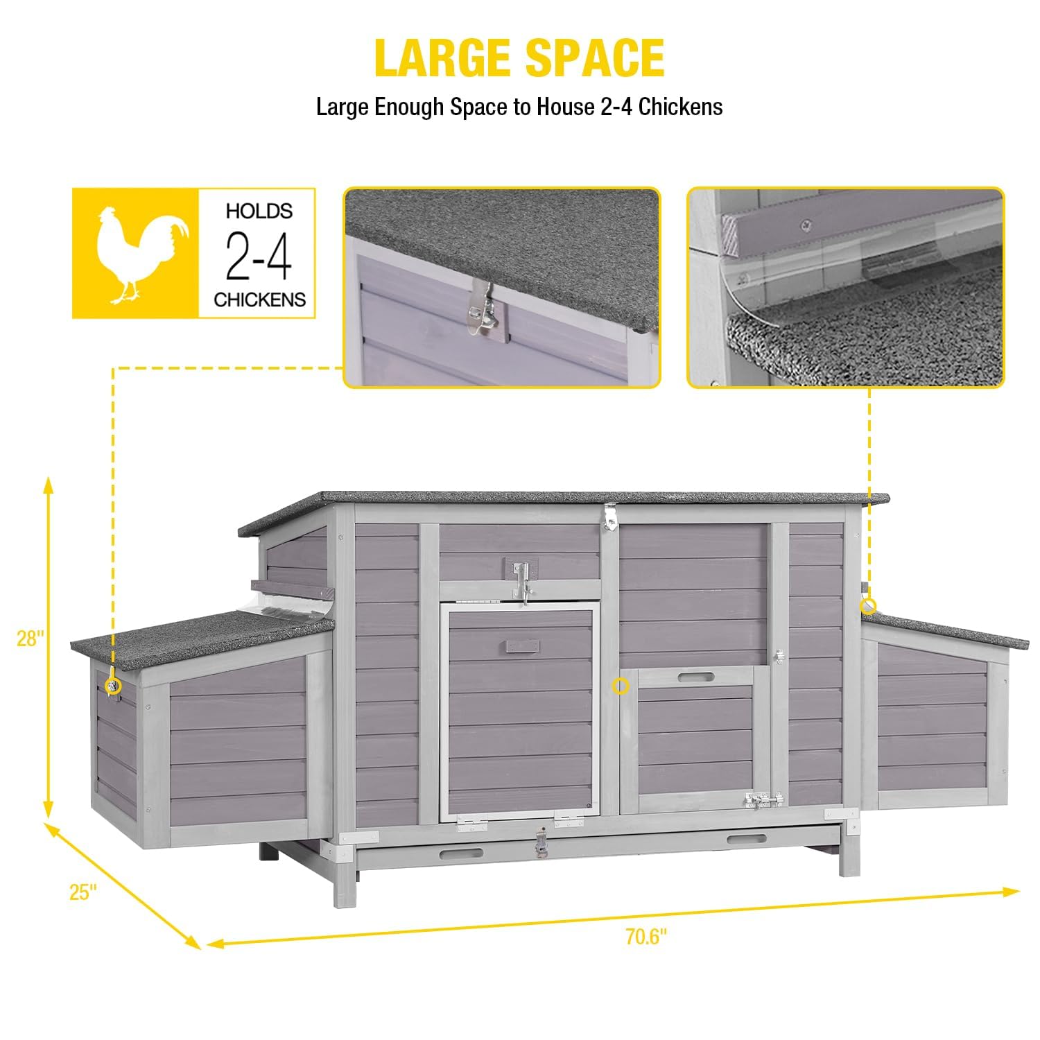 - DURABLE MATERIALS: The main body of the chicken coop is made of natural fir wood and asphalt waterproof roof. Upgraded to include stainless steel metal parts to strengthen the overall structure of the coop, making it stronger and more durable.