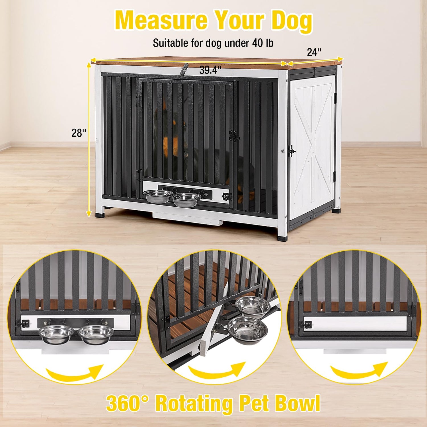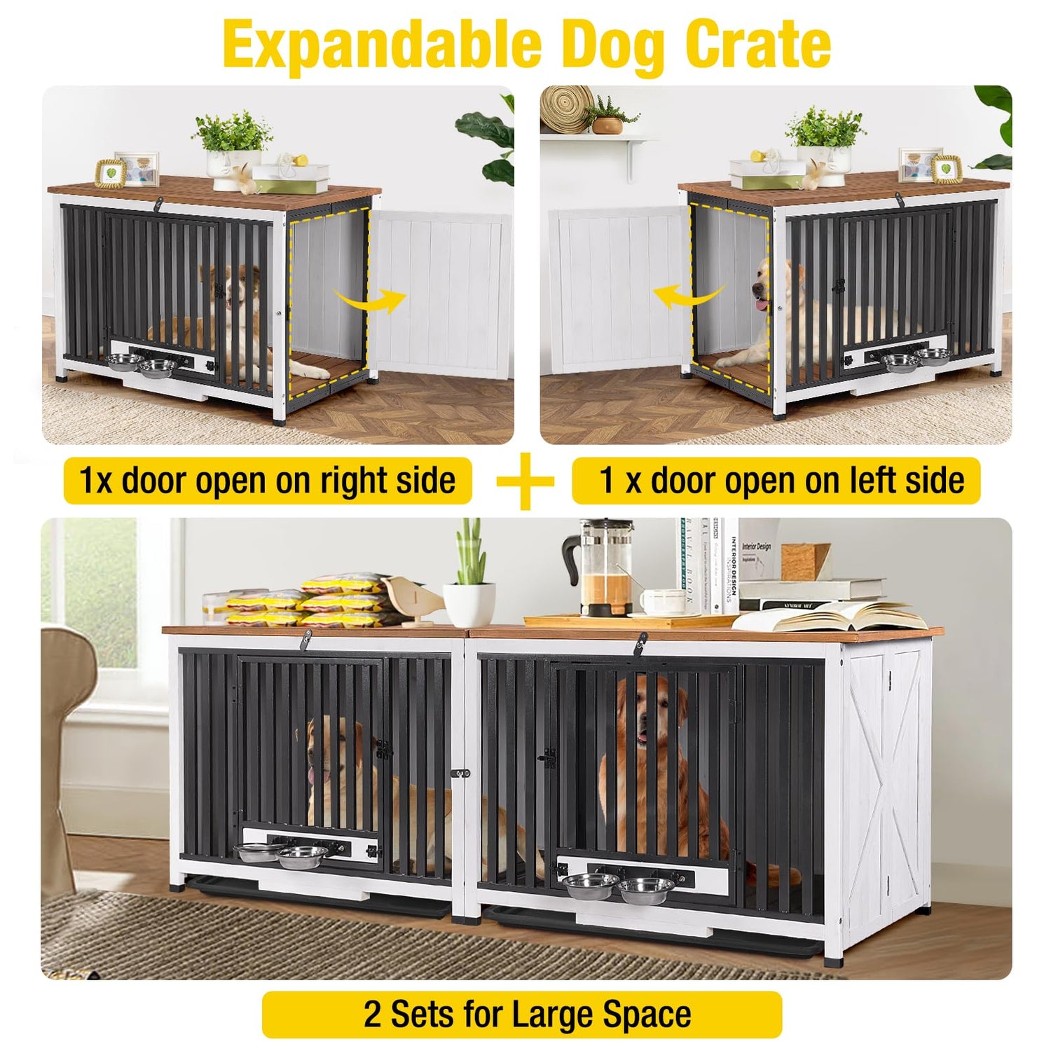 Aivituvin Dog Crate Furniture Foldable Side End Table Expandable Solid Wood Dog Kennel with 360° Rotatable Dog Bowls Indoor Cage, No Assembly Needed (Right Door)