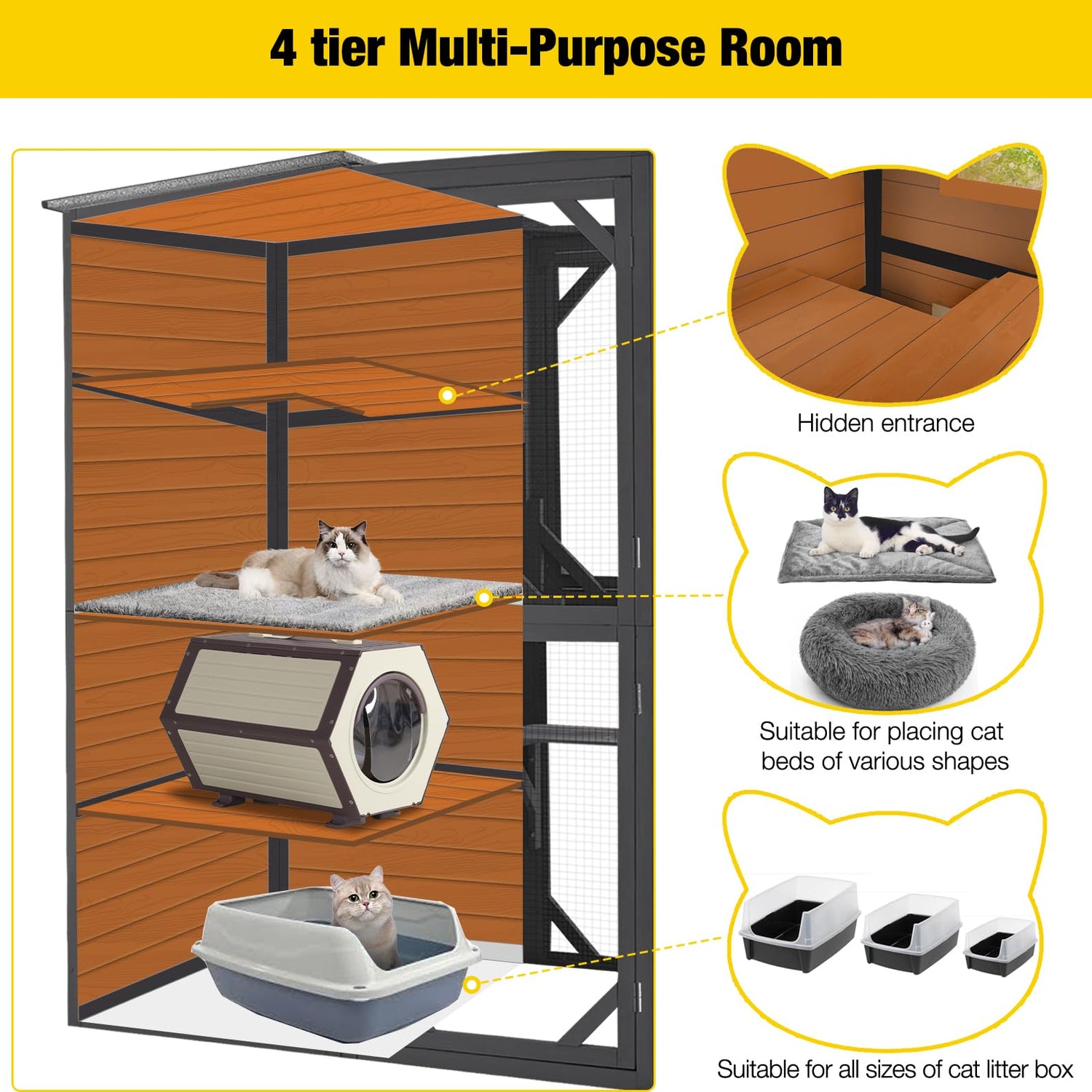 - Well-Designed Cat House: Outdoor cat enclosure includes 4 tier loft, 3 resting rooms, 5 windows (4 acrylic windows, 1 sliding window), 3 platforms. Spacious living area is the perfect solution to keep your cats, raccoons, squirrels, lizards, birds, pigeons safe and enjoy nature within a catio space