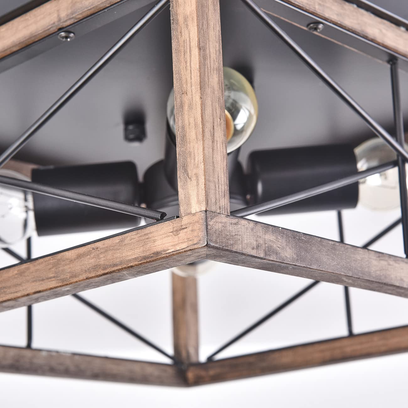 Aiwen 4-Light Rustic Wood Flush Mount Ceiling Light Metal Square Cage Farmhouse Lighting Close to Ceiling Light Fixture Black for Dining Room Bedroom Living Room Kitchen Hallway Entryway Foyer