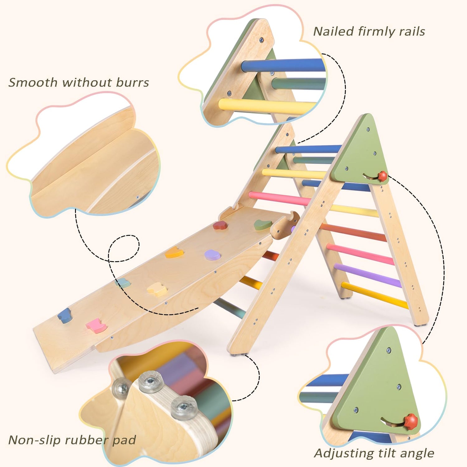 - 5-in-1 Pikler Triangle Set: This all-in-one climbing structure is perfect for growing toddlers. Use it as a climbing triangle with a slide, a triangle with a climbing ramp, or as a seesaw. Each component can be used separately as well. It's the ultimate indoor playset that evolves with your child's playtime needs