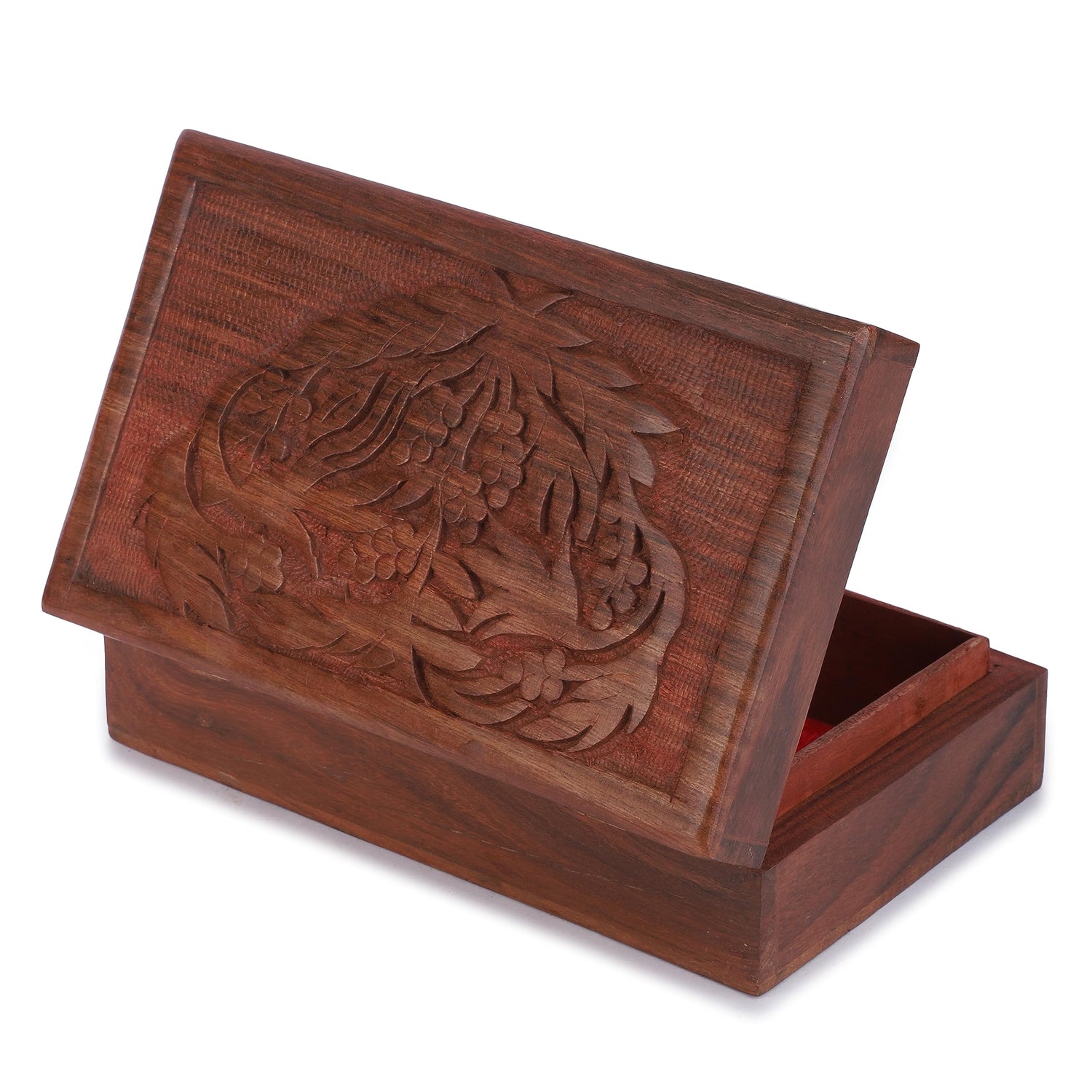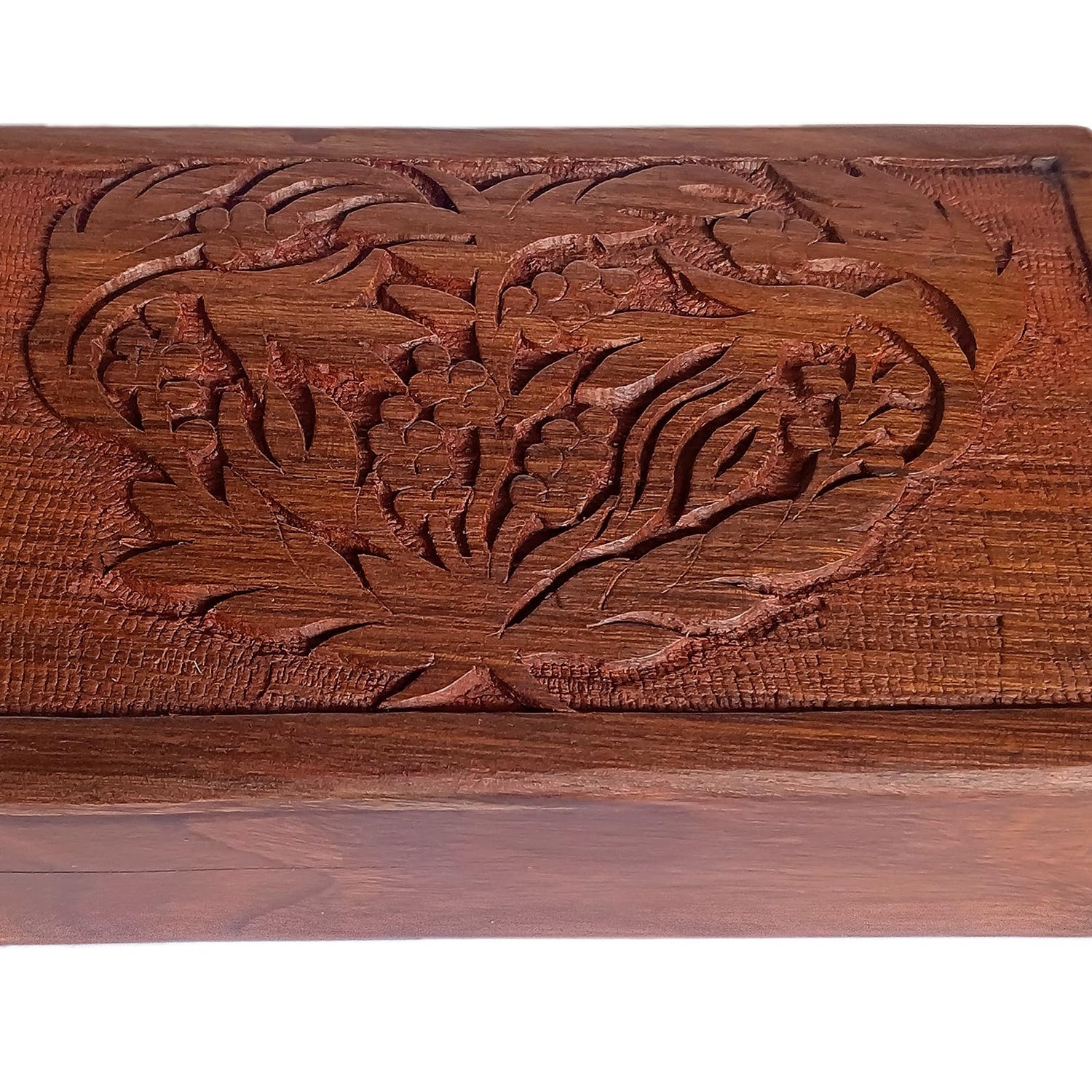 Crafted from high-quality Sheesham wood, this jewellery keepsake storage box exhibits exceptional durability and natural beauty. Sheesham wood, also known as Indian rosewood, is known for its rich grain patterns and warm hues. The natural variations in the wood add a unique character to the box, making it a beautiful piece of home decor. Hand-carved design featuring an intricate Flower Leaf Design motif adds a touch of artistic elegance. Versatile functionality - use it to store jewelry, watches, small accessories, or simply as a decorative item. Thoughtful gift for special occasions like birthdays, anniversaries, or as a token of appreciation. The latching lid ensures secure closure, keeping your cherished items safe and organized. Enhance your living space with a blend of utility and aesthetics with this exquisite wooden chest.