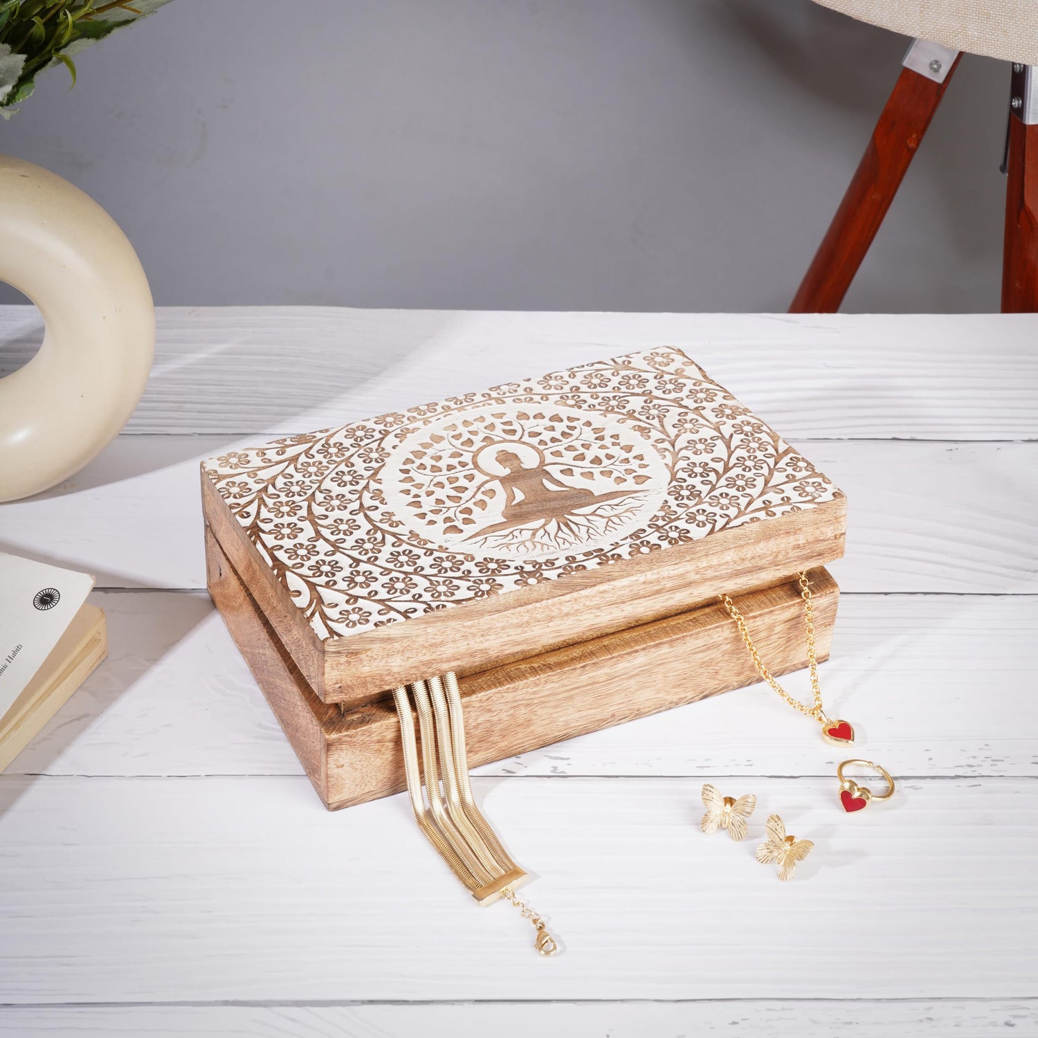 Ajuny Wooden Handcrafted Decorative Jewelry Storage Box Buddha Tree Design White Multipurpose Treasure Chest Organizer Travel Keepsake Trinket Holder Watch Box Gifts 8x5 Inch