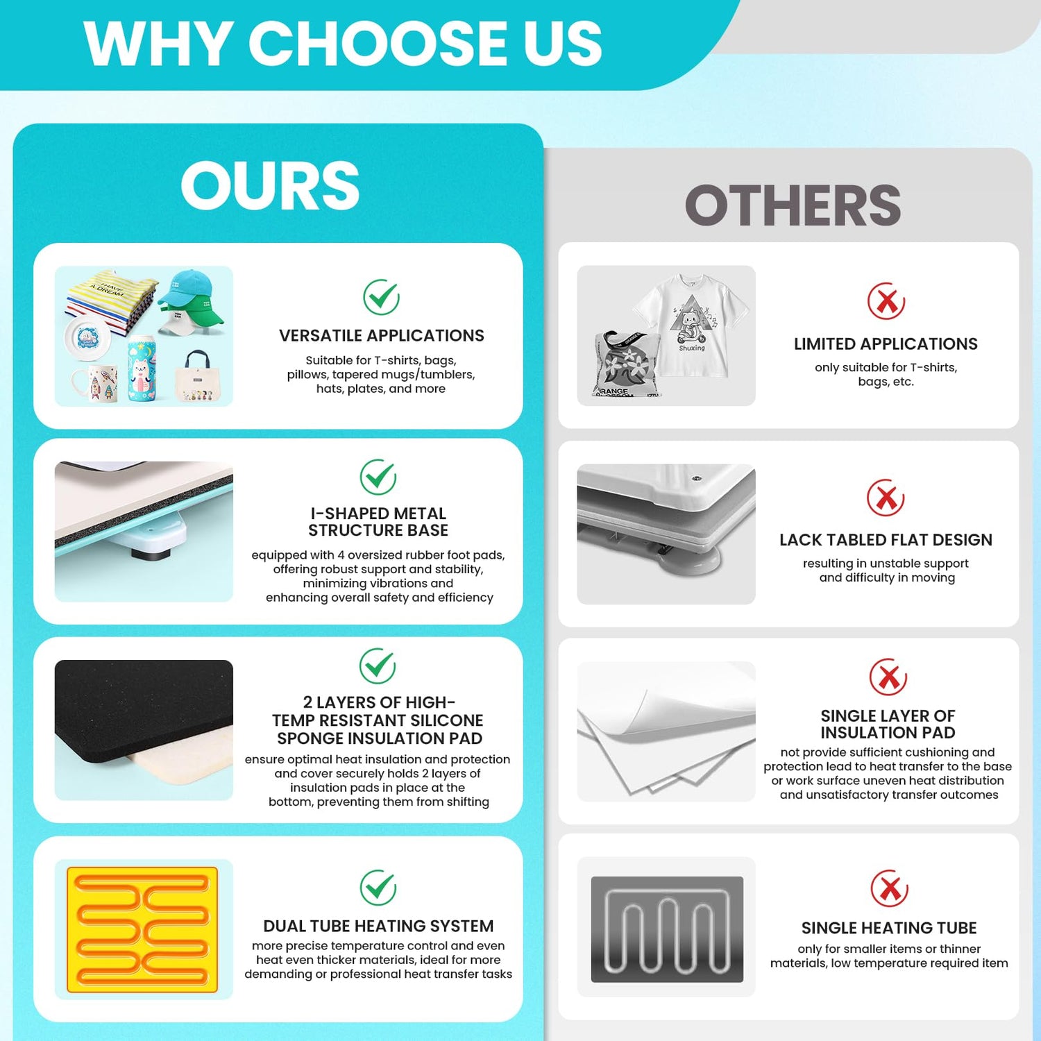 - 【15x15 & 30OZ Large Size Press】Tackle large projects effortlessly with a 15x15" oversized heating plate. Ideal for full-coverage transfers on hoodies, canvas bags, and wood signs. 30OZ tumbler press is a great addition. With our adjustable tumbler press attachment, you can sublimation print 2 PCS 11oz - 15oz mugs at one time or print 1 PC straight sublimation tumbler in 16oz, 20oz, 30oz. It's perfect for both home enthusiasts and small-scale businesses.