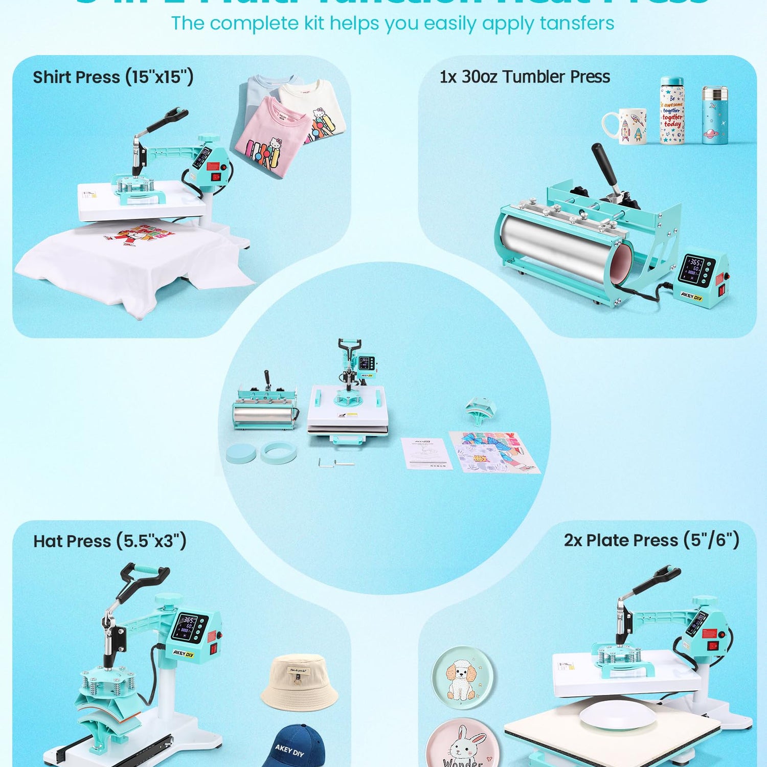 - 【Comprehensive Combo】★★5 in 1 Combo: ①15 "x 15" T-shirt heat press machine*1 ②Tumbler Press Machine 30oz*1 ③Hat press machine*1 (5.5 x3 inch, Curved) ④5'' Plate Heating Pad*1 ⑤6'' Plate Heating Pad *1. Other Accessories Bonus: DTF sticker*3 + patterned sublimation paper*1 + hex key. comes with professional guidance and instructional videos for a quick start. 1-year manufacturer's warranty and lifetime customer service. If you have any questions, please reach out, and we'll tailor a solution for you.