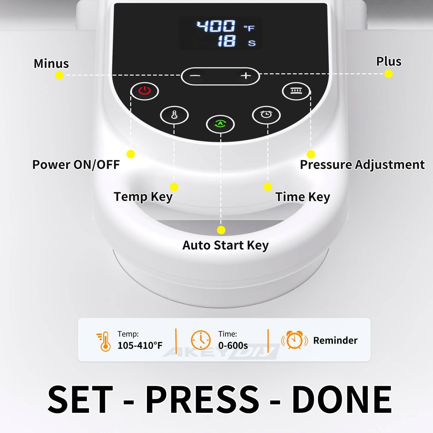 - ⭐【Digital Control & Automation】Full digital temperature and time display - clear display, easy to set temp and time. Temp: 105F-410F/ 40C-210C, Time: 0-600s. After setting up the heat press parameters, you only need to press "A" button, the heat press machine will automatically press your design. Auto Shut Off & Overheat Protection - The machine shuts off automatically after 20 mins without operation