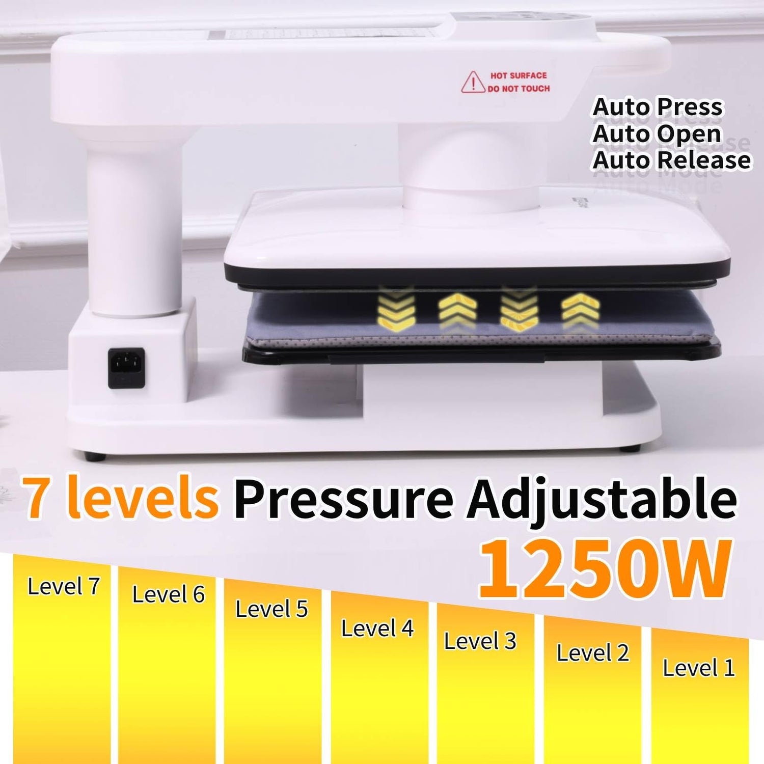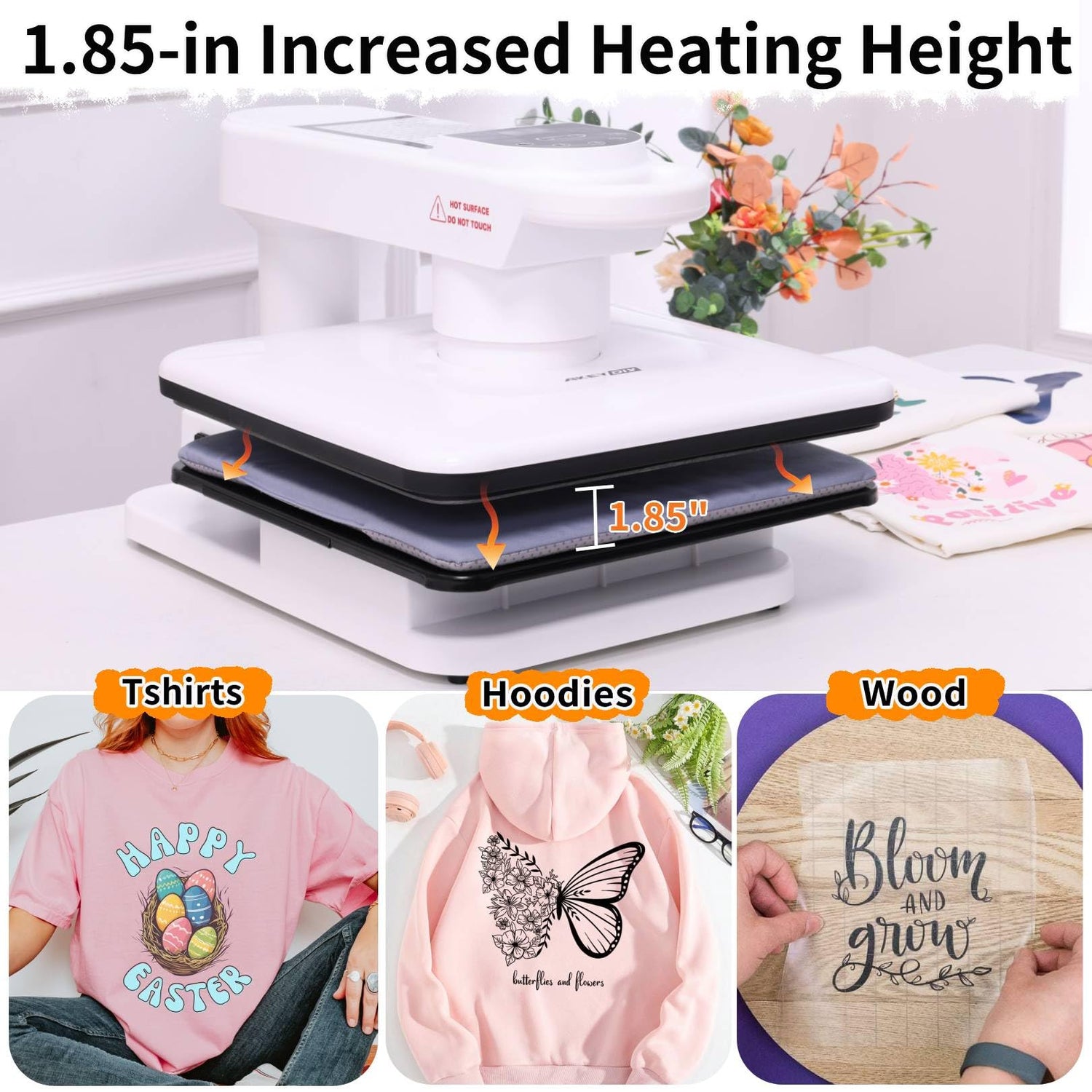 - ⭐【Versatile Application Range】This auto heat press great for t-shirts, totes, and apparel. With a heated height of up to 4.7 cm (1.85 in), you're ready to go with larger, more varied projects. Whether you're pressing pure cotton,polyester, chemical fiber, pearl board, metal pendant, mouse pad, glass, ceramic, or complex materials, this swivel auto heat press can handle a wide range of applications with its customizable settings