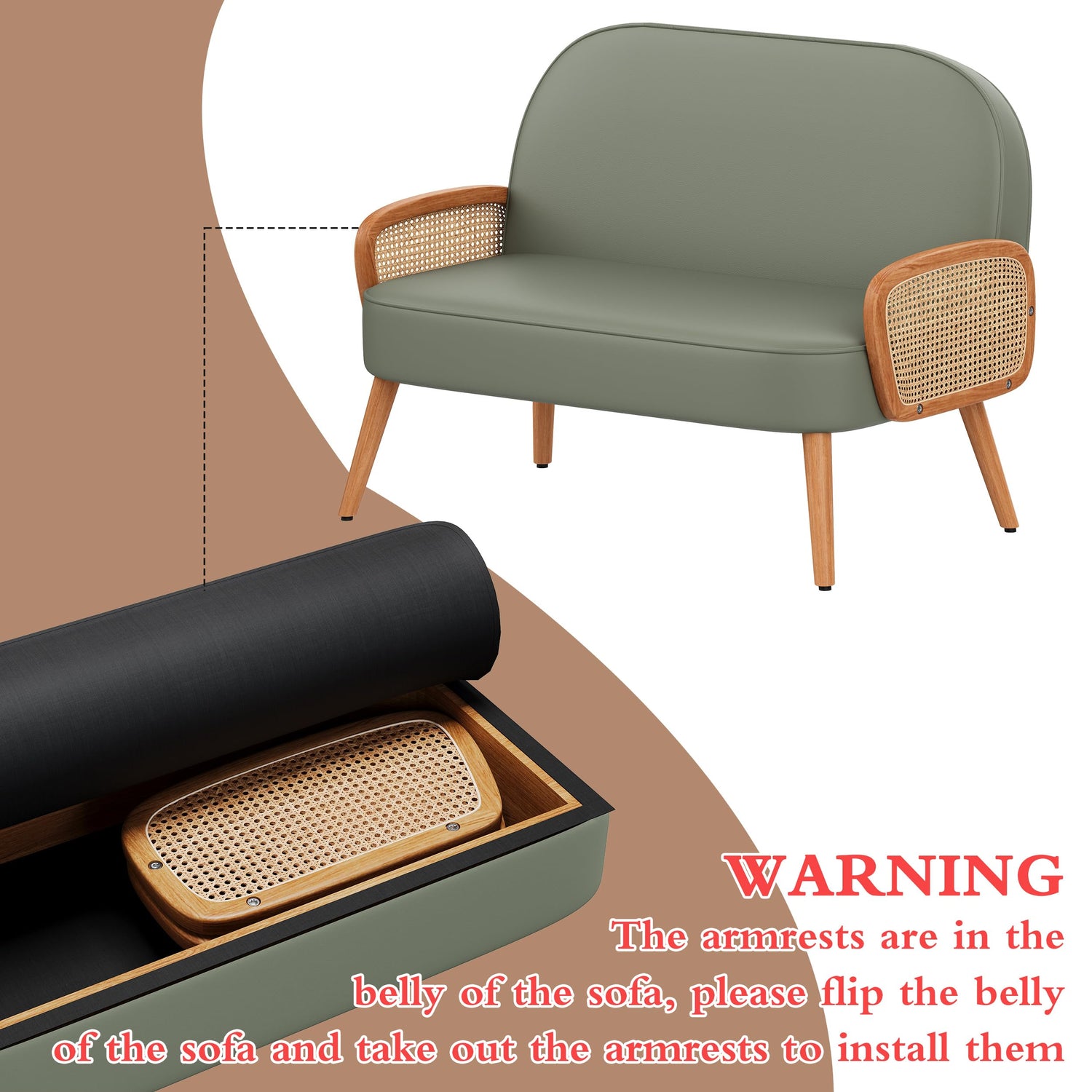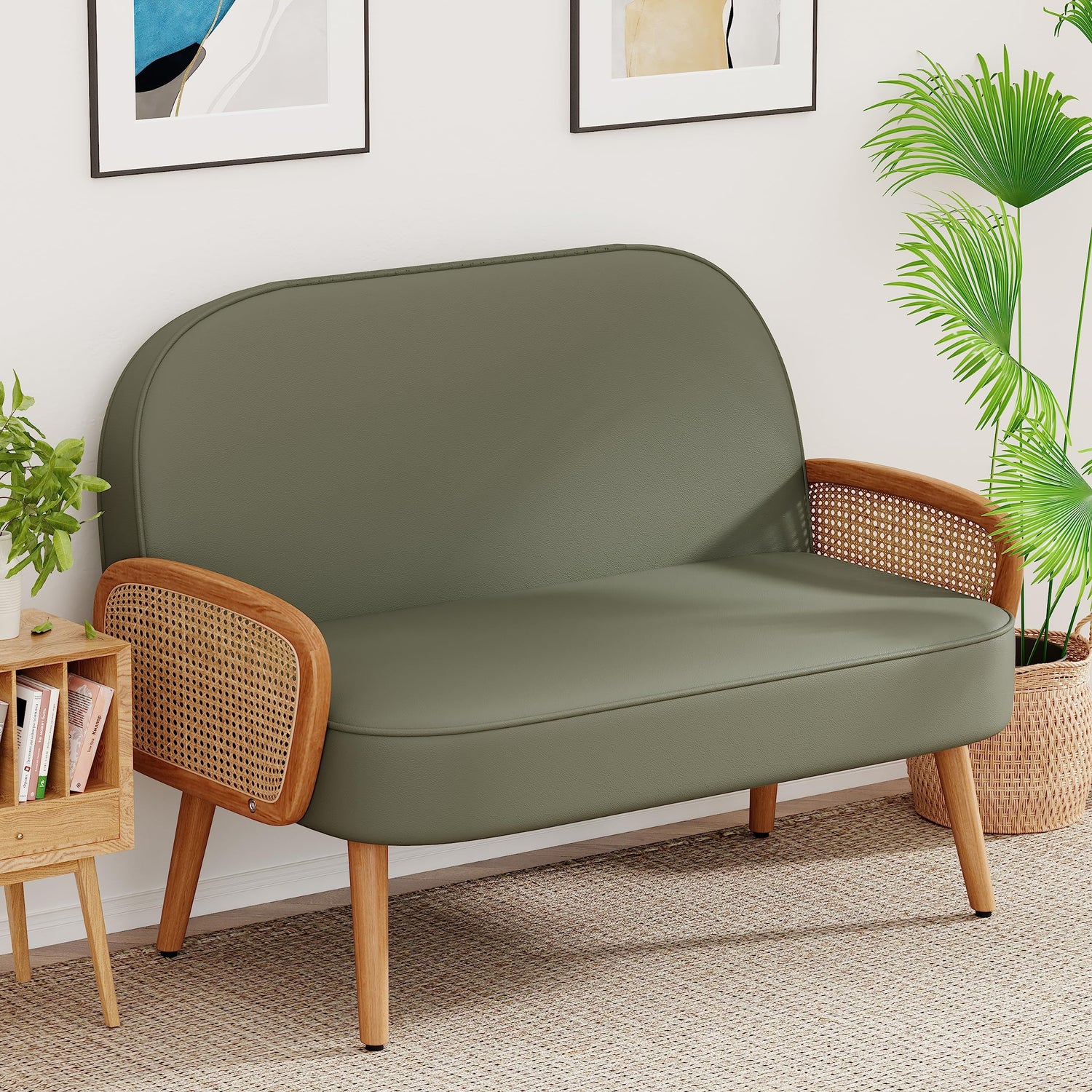 Aklaus 45" W Faux Leather Small loveseat with Natural Rattan Arms,Upholstered Modern Mini Sofa Couch Love Seat Settee Bench with Back for Living Room Bedroom Office Small Space Entryway Green